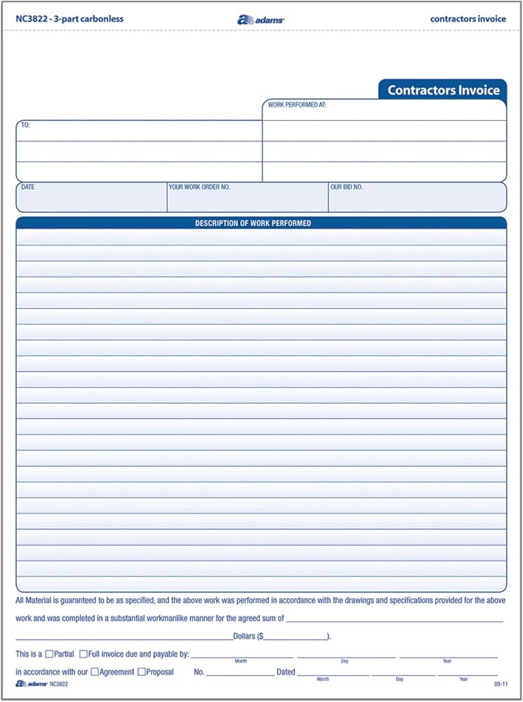 Adams provides the tools to help businesses keep track of messages, finances, transactions, employees, taxes, and customers. Adams Business Forms were designed to help businesses in the service industry itemize and organize customer information and material or labor costs. The Adams Contractor Invoice Forms feature a large description area for details about work performed and additional charges. These 3-part carbonless forms feature a white, canary, pink paper sequence to instantly create extra copies of all work performed, and each package contains 100 unit sets. Each form measures 8 ½ x 11 inches, detached size. Whether it's a multi-part form, notebooks, writing pads, record books, or any of the hundreds of items we offer, you can count on Adams products to help!