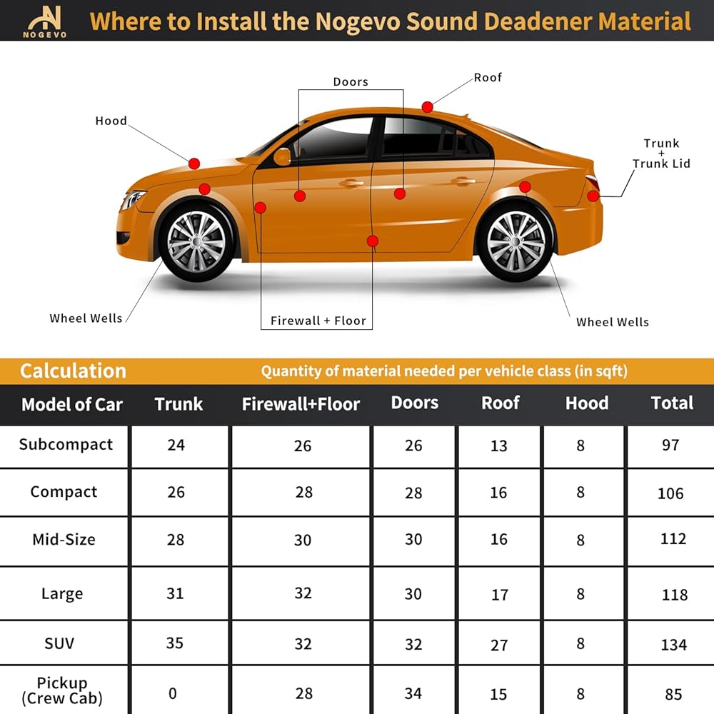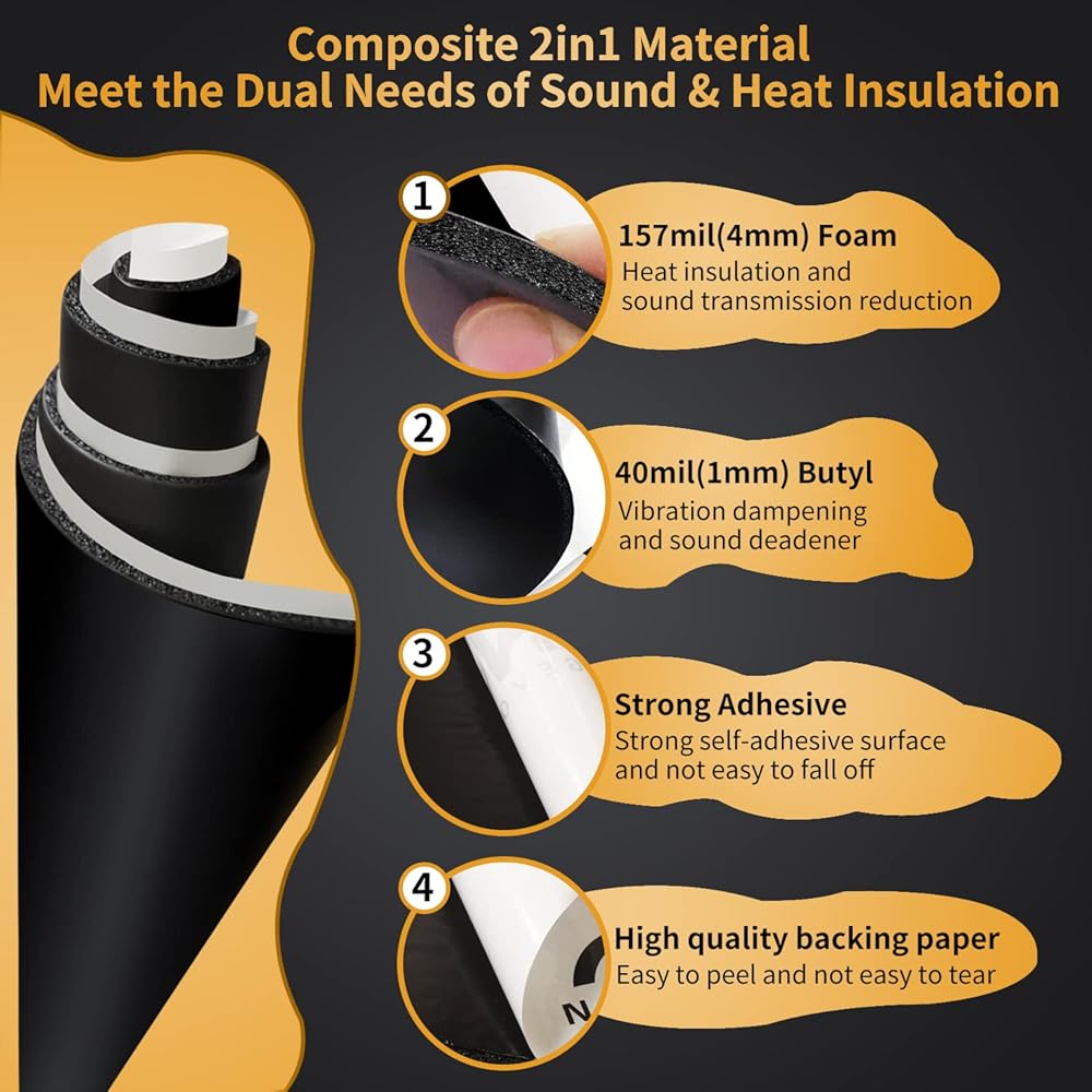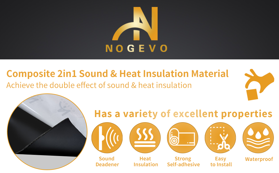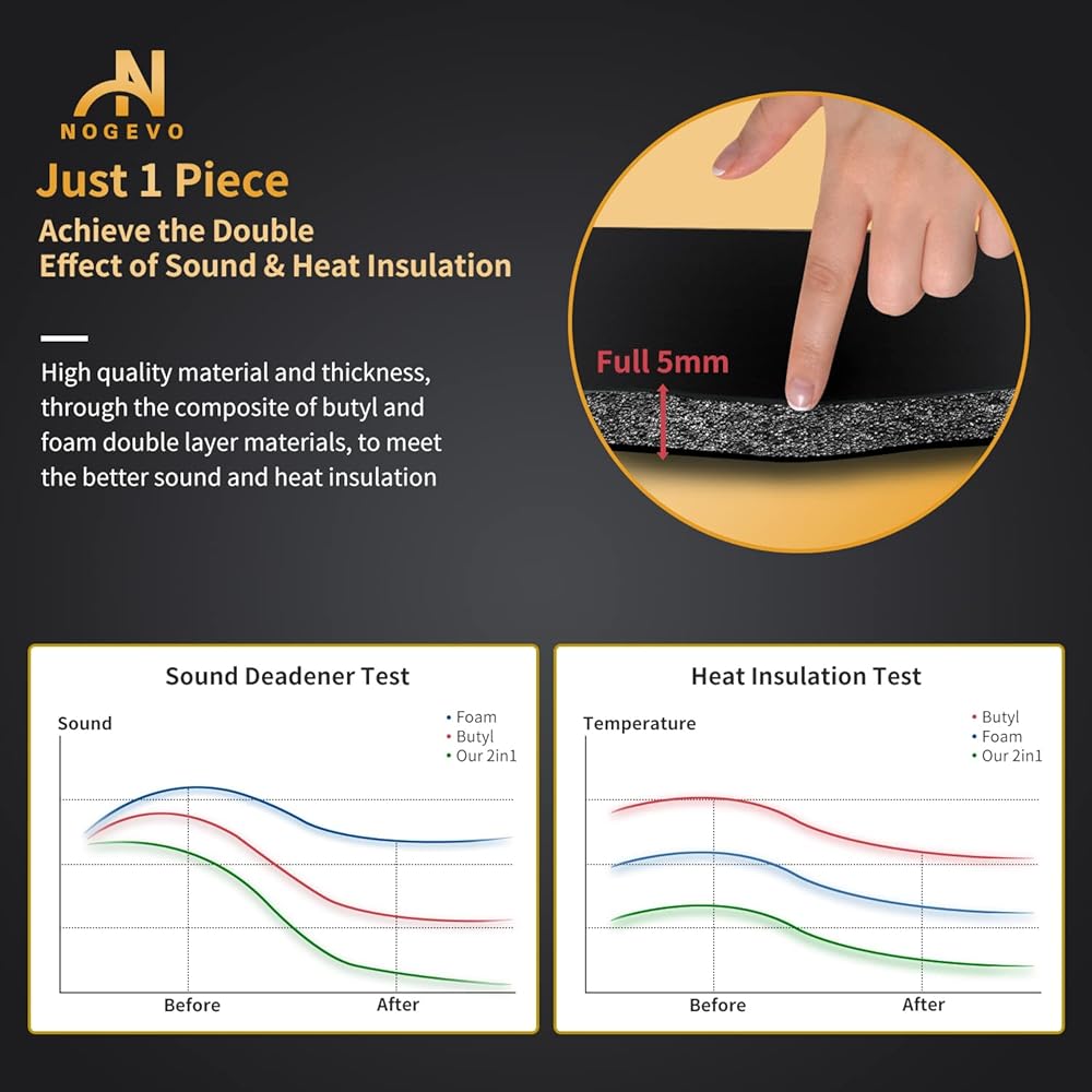 [Composite 2in1 Material, Meet the Double Requirement of Sound & Heat Insulation] Nogevo car sound deadener is composed of 157mil foam and 50mil butyl. The internal structure of coarse cellular foam can better reduce the transmission of sound and heat. Butyl mainly plays the role of vibration dampening and sound insulation. Only this product can achieve the double sound and thermal insulation which now has to be purchased separately from two materials on the market. Nogevo, save money and labor.
