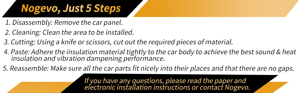[Easy to Install, Wide Application] Nogevo auto vibration dampening is easy to install, only 5 steps. Disassemble - clean - cut - paste - reassemble, everyone can do it. Nogevo 197mil car noise deadening thickness, suitable for any position on the car, such as hood, firewall, doors, trunk, garage, engine and other parts of the vehicle. Nogevo, saves time and effort.