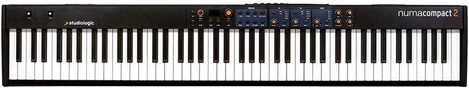 The Numa Compact 2 88-Note Semi-Weighted Keyboard with Built-In Speakers from Studiologic is a compact and lightweight keyboard that features 88 sounds, digital post-processing effects, and full MIDI controller characteristics. With the built-in speakers and the internal digital amplifier, it can be used in training sessions, at home with headphones, or on a live stage, and more. Expressive performance is performed with two ergonomic metal stick-controllers and aftertouch. The keyboard's velocity sensitivity, or "touch", is also programmable to soft, medium, hard, or fixed responses, allowing for various levels of control. It can support polyphony up to a maximum of 128 voices.