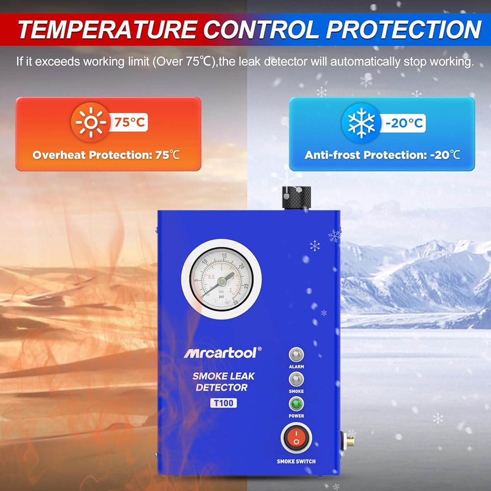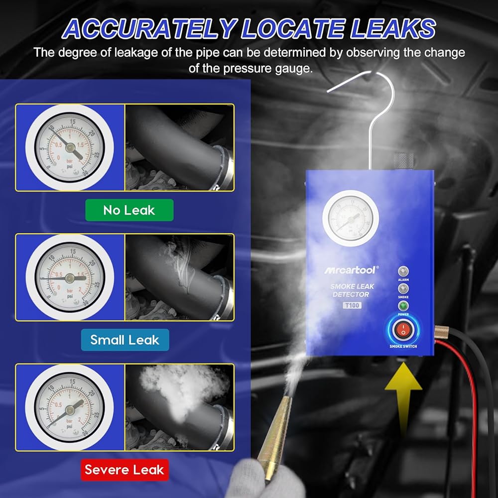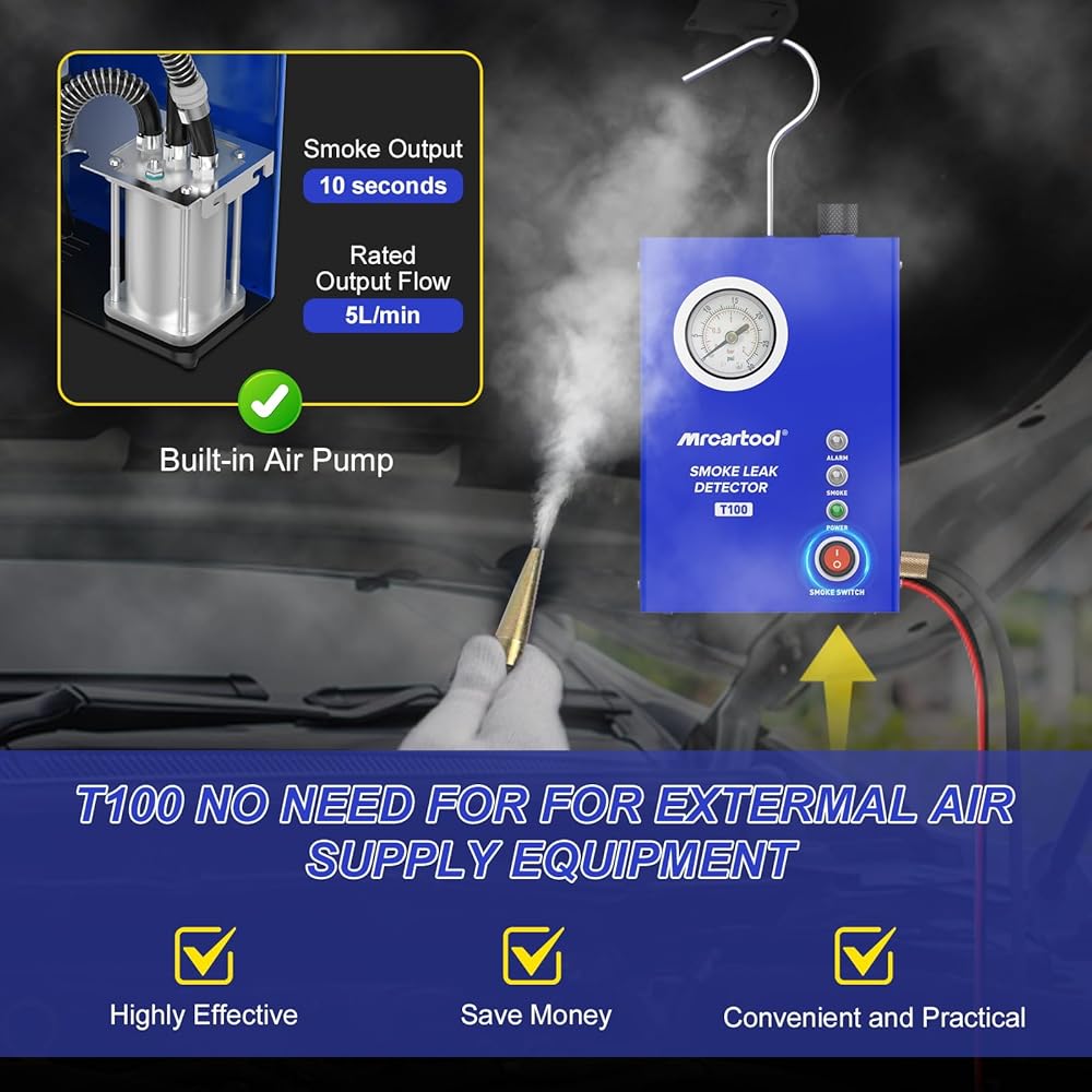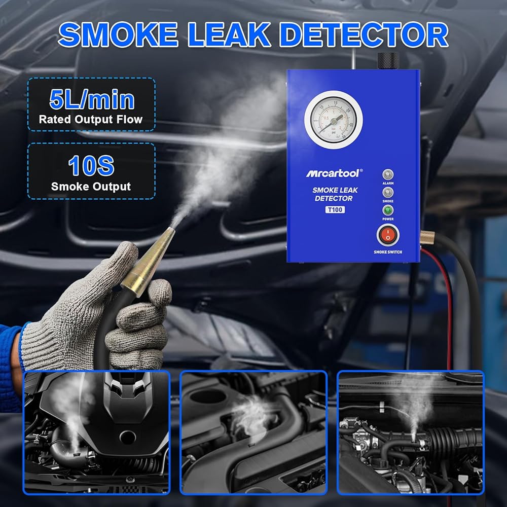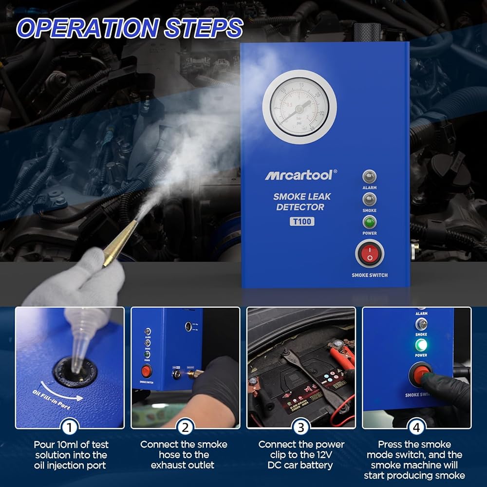 【Smoke Machine T130】MR CARTOOL EVAP Leak Detector T130 is a professional machine for automotive pipe system leak detection. Can be used for EVAP System, Car Sealing, Intake System, Exhaust System, Crankshaft System, Fuel Tank System, Turbo Leaks and Various Pipe Fittings. NOTE: Not suitable for air conditioning system piping.