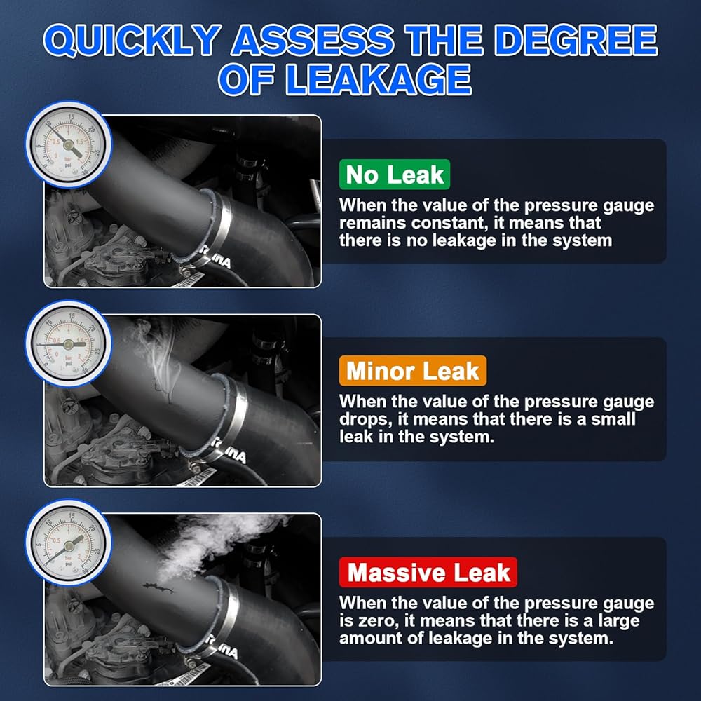 【Complete Set】Comes with 4.92ft Smoke Hose, EVAP Special Connector, Standard Cone Adapter, Power Cord Clamp, Valve Core Wrench, Airbag Adaptor, Rubber Connector Part, 3.38oz Empty Bottle for test oil(Please notice: Package does not include the baby oil), Various of Soft Rubber and Hard Rubber Hose Plugs.