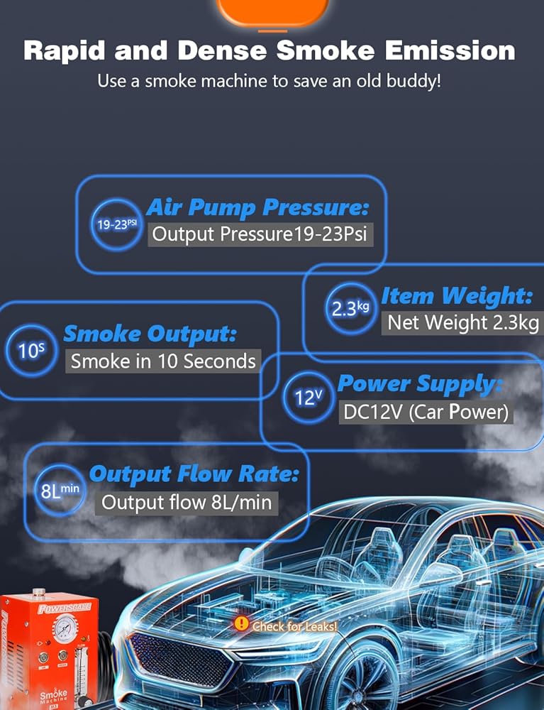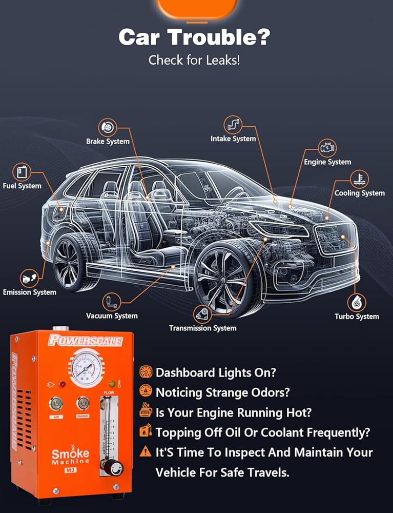🕵【Comprehensive Leak Detection】The PowerScale M3 Automotive Smoke Machine can easily inspect various vehicles, including older models, for leaks in throttle shafts, engine blocks, turbo test systems, crankcase systems, intake systems, exhaust systems, fuel tank systems, EVAP systems, EGR systems, cooling systems, and various pipe fittings.