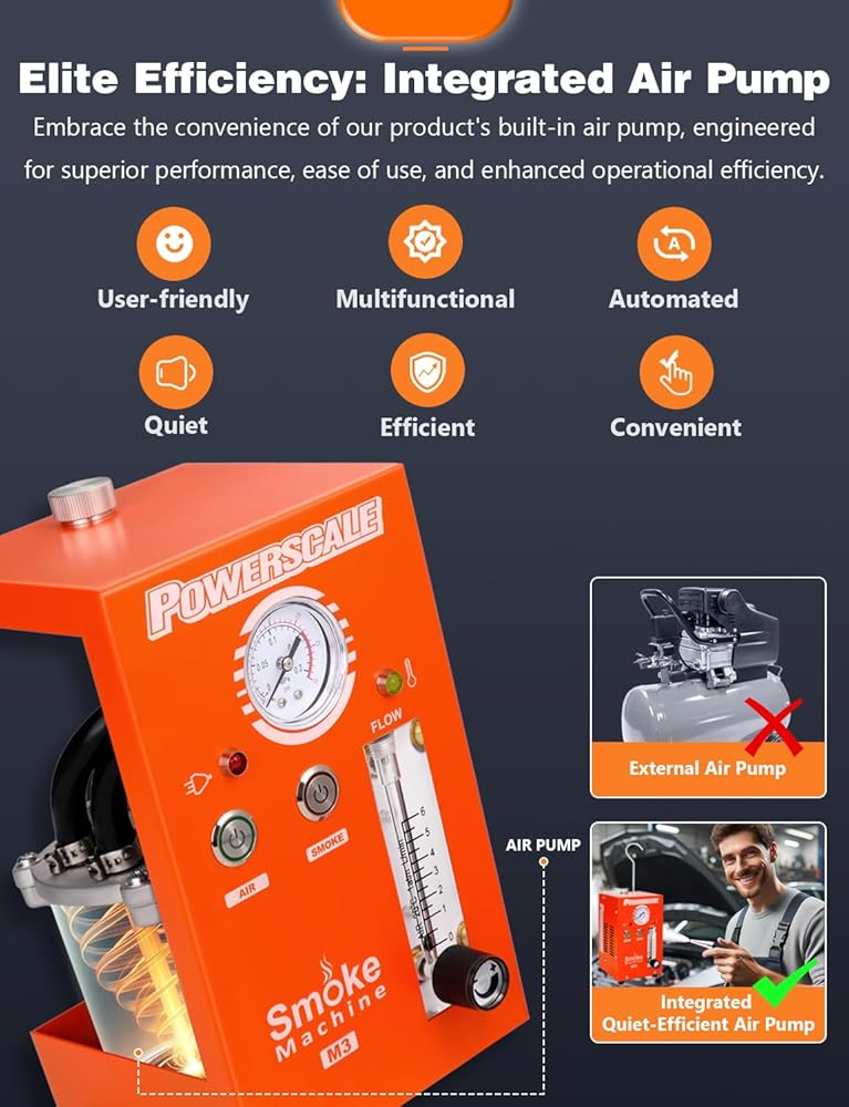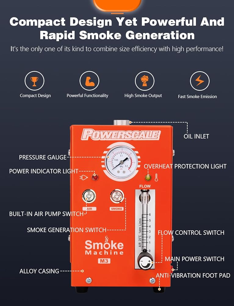 🧰【High Performance and Premium Build】The PowerScale M3 does not require an external air source, equipped with a built-in air pump, pressure gauge, and adjustable flow meter. Its compressor can generate air pressure from 19 to 23 psi, allowing smoke to be easily introduced into the system being tested, speeding up the leak detection process.