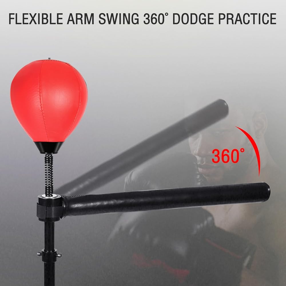 360° Rotating Reflex Pole: The standing reflex boxing bag comes with a 360° rotating reflex pole, perfect for training reaction, accuracy, and flexibility. The flexible 360° rotating pole not only exercises arm muscles and helps with weight loss but also enhances coordination and reaction speed