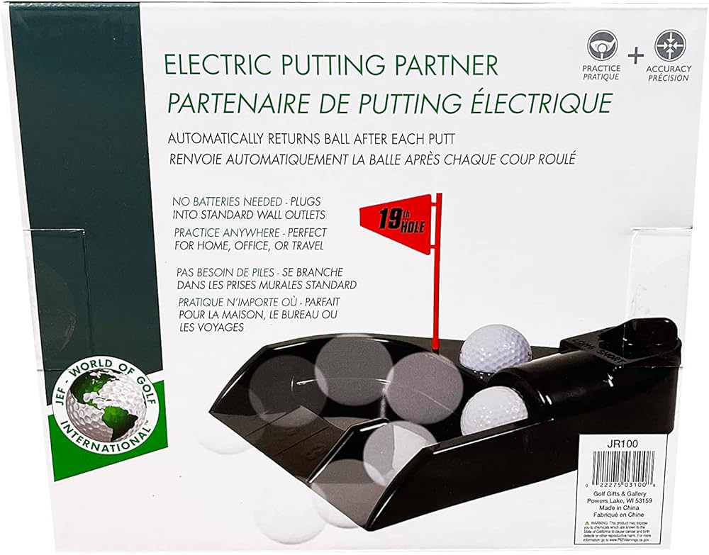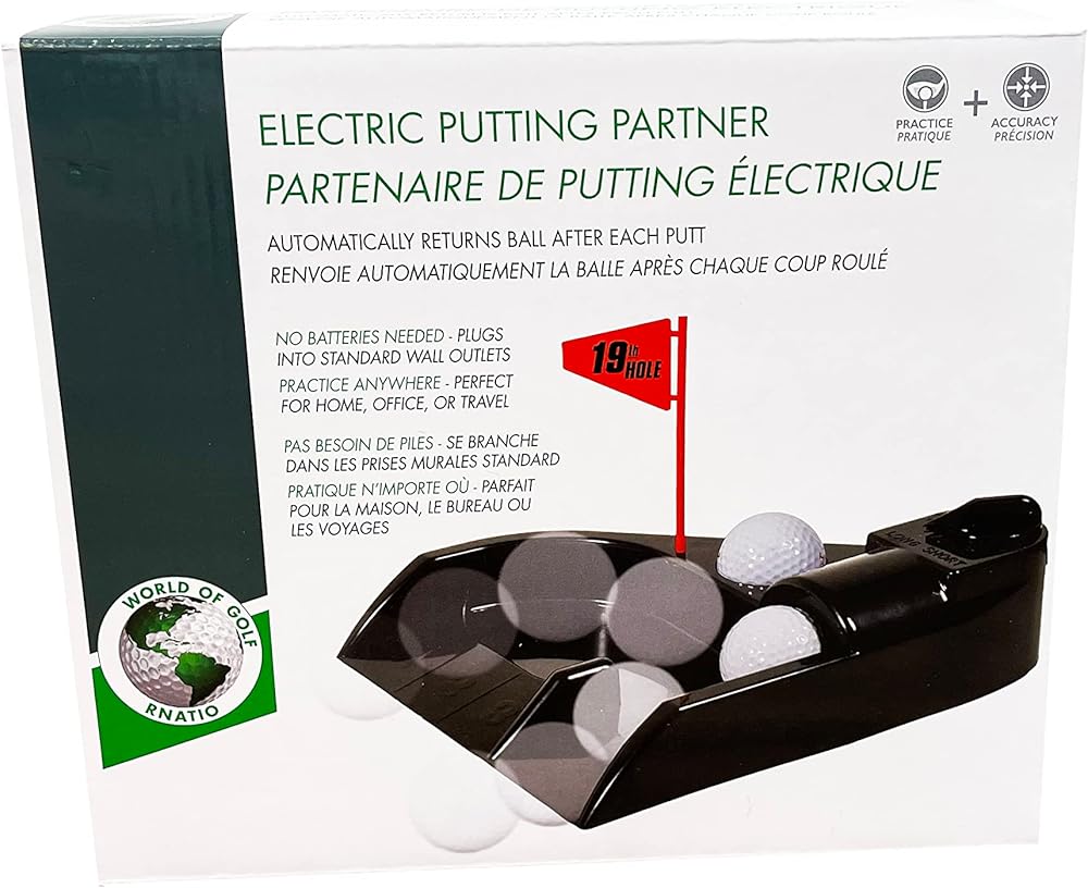 Improve your putting skills--indoors or outdoors and any time of year--with the Electric Putting Partner. This handy putting trainer features numbered scoring zones and a wide entrance to help you hone your skills. Thanks to automatic ball return, the Putting Partner allows for continuous, un-interrupted practice, and the trainer adjusts for short or long putts to suit your practice needs. Whether you want to refine your putting game in the off season or keep your skills sharp all-year round, the Putting Partner provides a handy solution.
