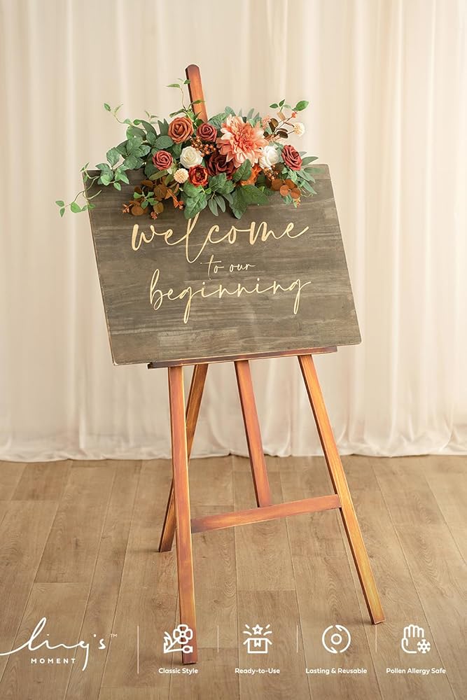 Wedding welcome sign flowers: Pre-fabricated flower swag x 1 + cable zip tie x2 + metal clip x2(not include welcome sign & stand), which helps to create your romantic fall/boho rust sepia/winter wedding.