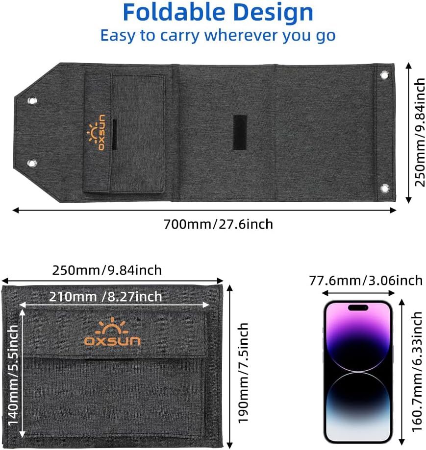 【Foldable and Portable】Folding design (unfolded size: 27.6x9.84in, Folding size: 9.84x7.5 in), the solar panel charger weighs only 1.36 lbs. It's easier to carry around outdoors than other solar panels.