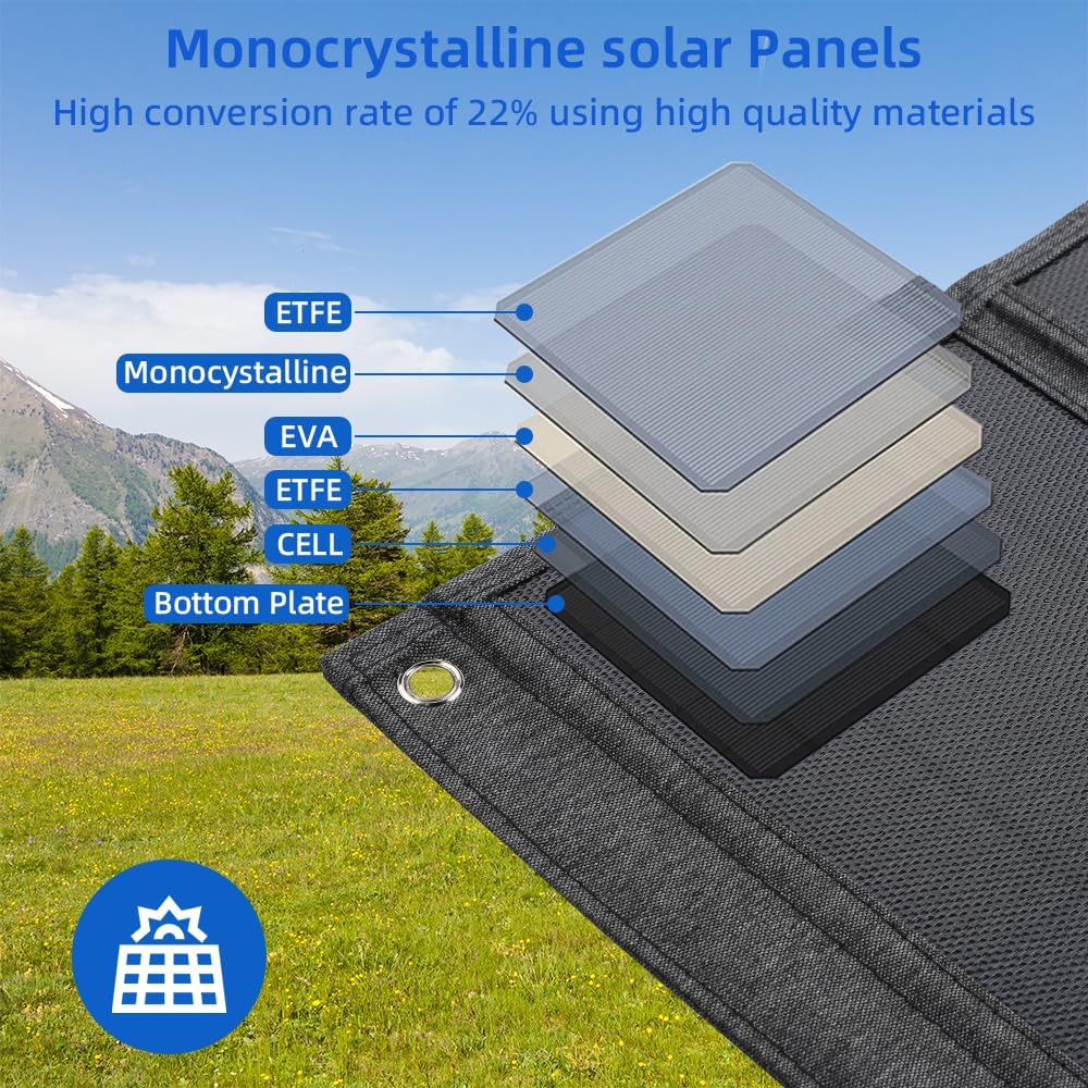 【Durable and Reliable】The ETFE lamination technology extends the life of our solar panels. IP65 protection prevents water and dust. (The junction box is not waterproof. Please don't immerse the solar panel charger in water).