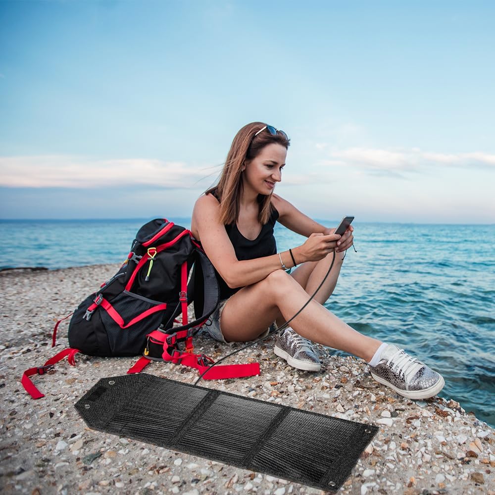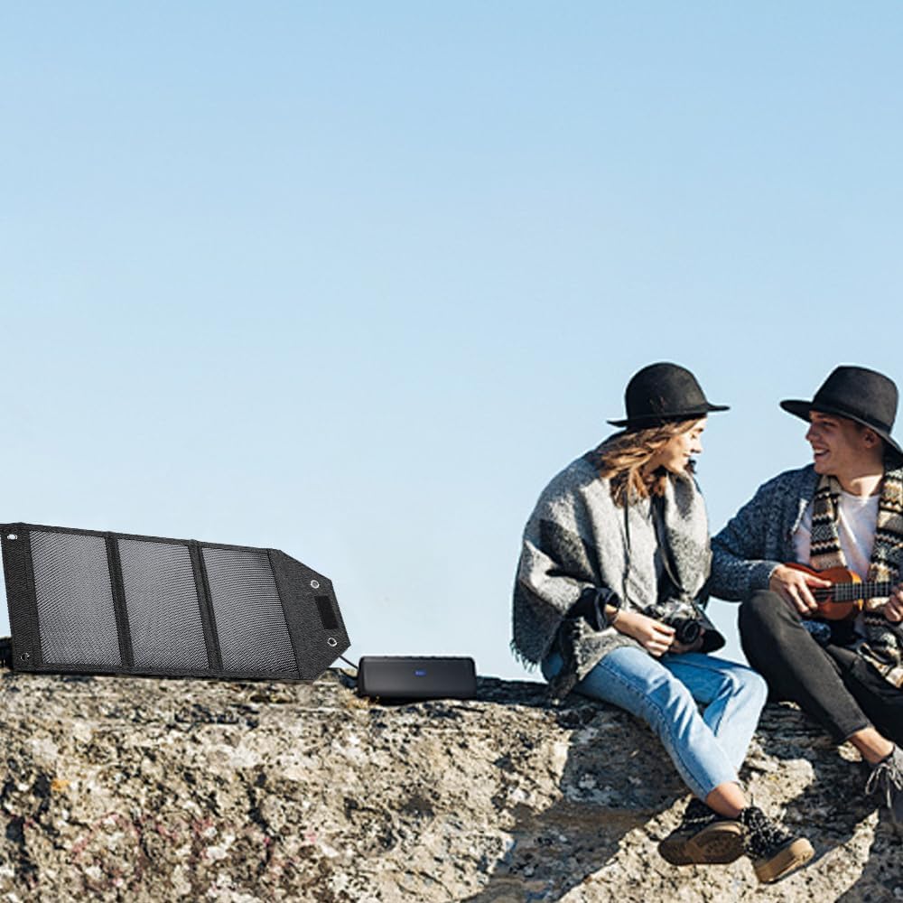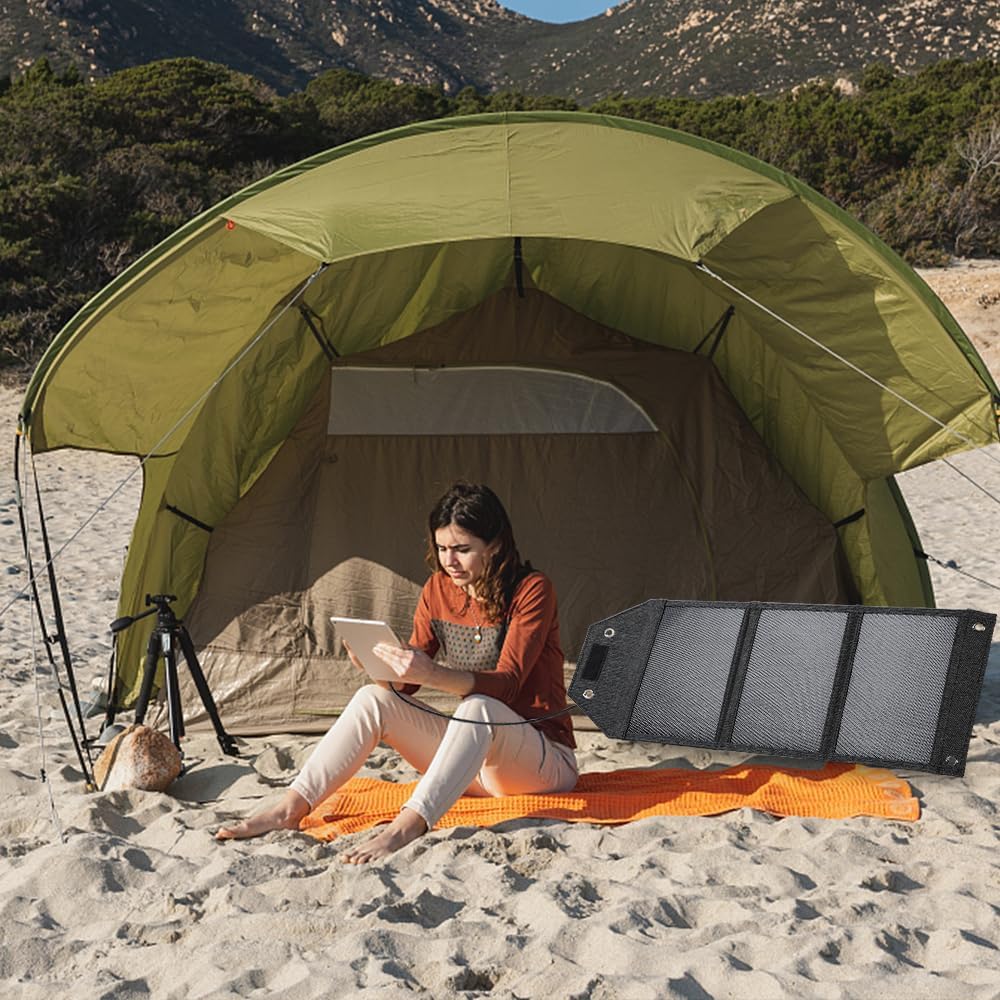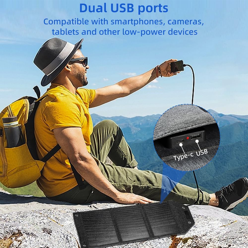 【Widely Compatible】Dual USB ports, Only the USB-C port supports fast charging for better efficiency. Meanwhile, the portable solar panel can charging two devices sunch as smartphones, small fans or other low-power devices.