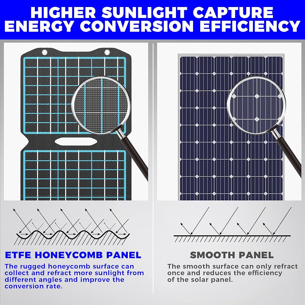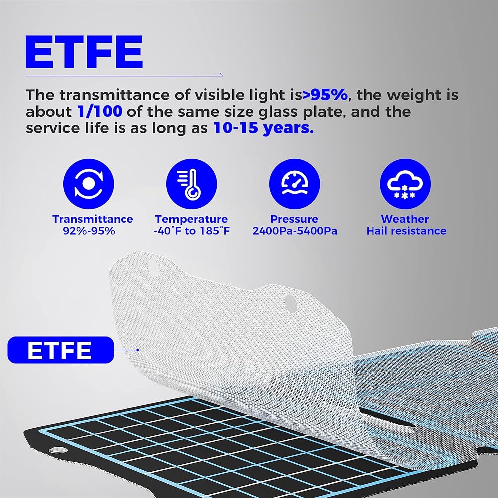 🔋【Durable ETFE Material】This foldable solar panel charger with ETFE material transmits light up to 95% to absorb more sunlight. Our monocrystalline solar panels adopt aviation grade impact resistant material, the monocrystalline cell and impact-resistant material is truly compounded together to make the surface of the solar panel stronger, thinner, lighter, and has a longer life than the first-generation PET and second-generation ETFE on the market.