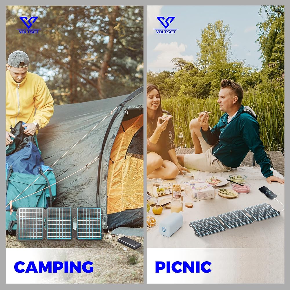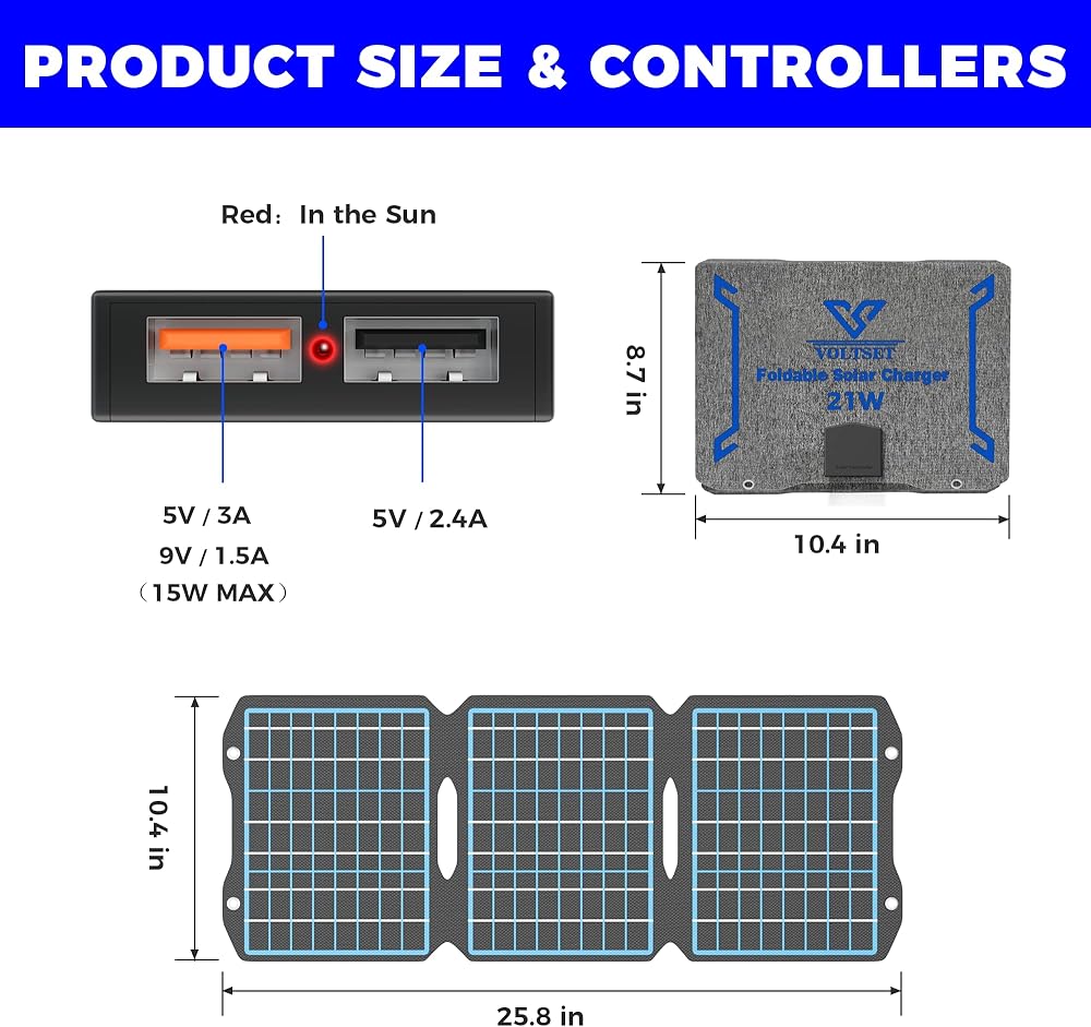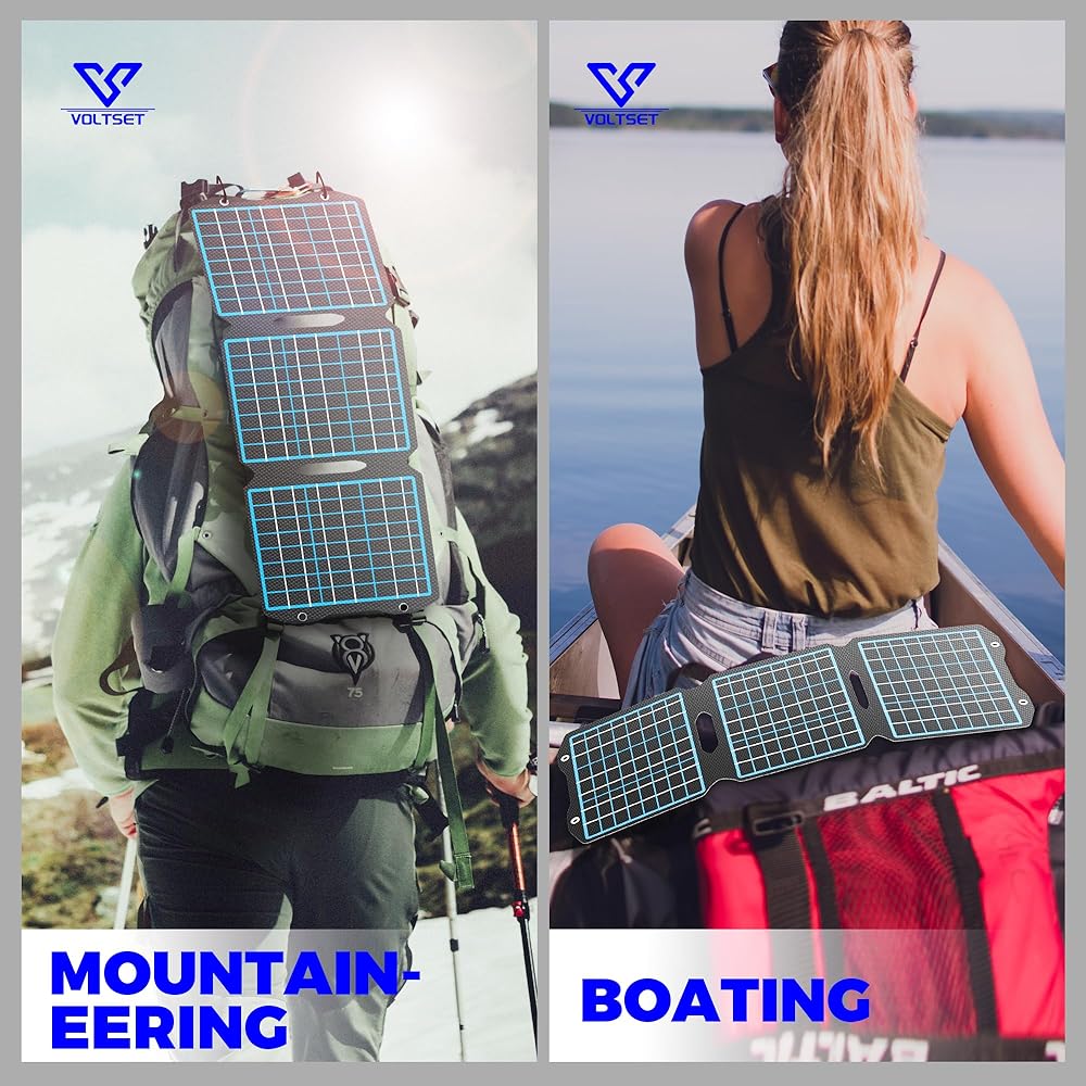 🔋【Portable & Foldable Solar Panel Charger】VOLTSET solar panels charger are portable foldable (8.7× 10.4in folded) and equipped with 2 metal hanging holes, you can easily hang it on your backpack or a tree to get solar energy, easy to carry everywhere use is ideal for camping, hiking, climbing, fishing or off-grid. It is also a must-have for stashing in an emergency kit.