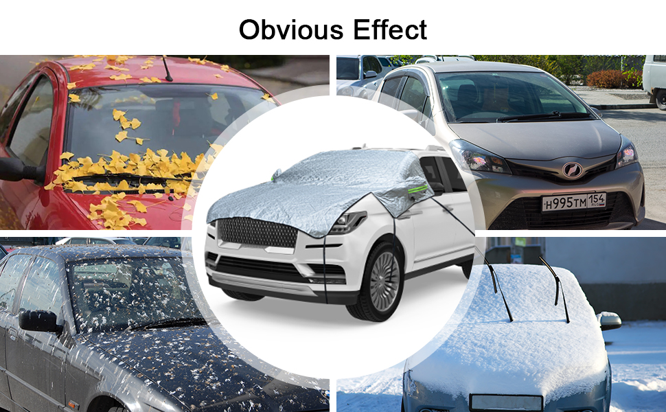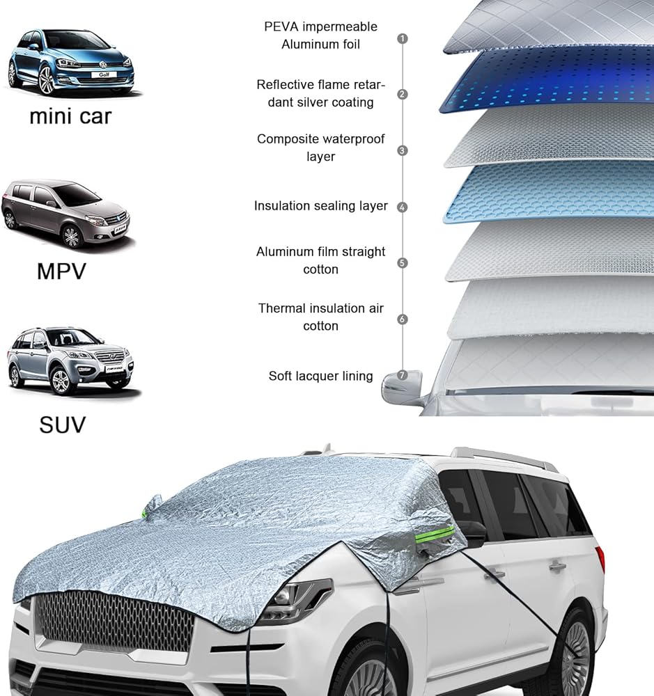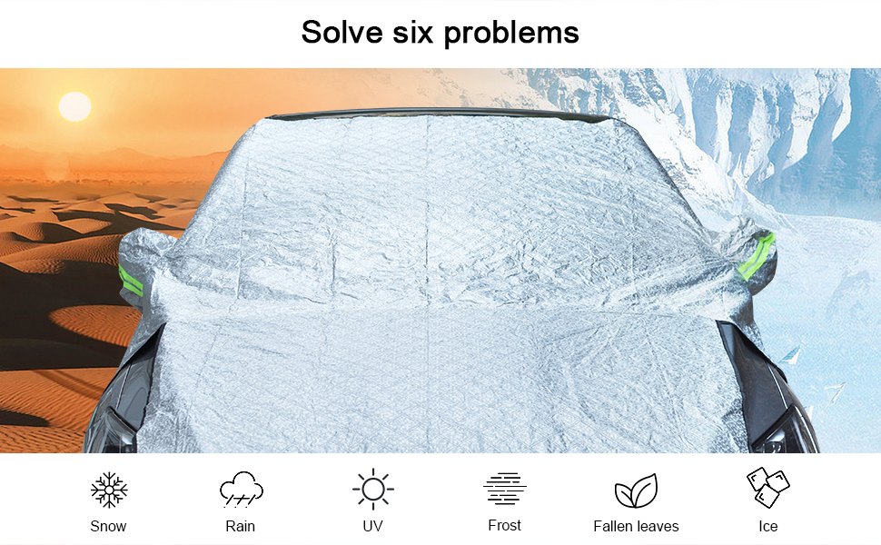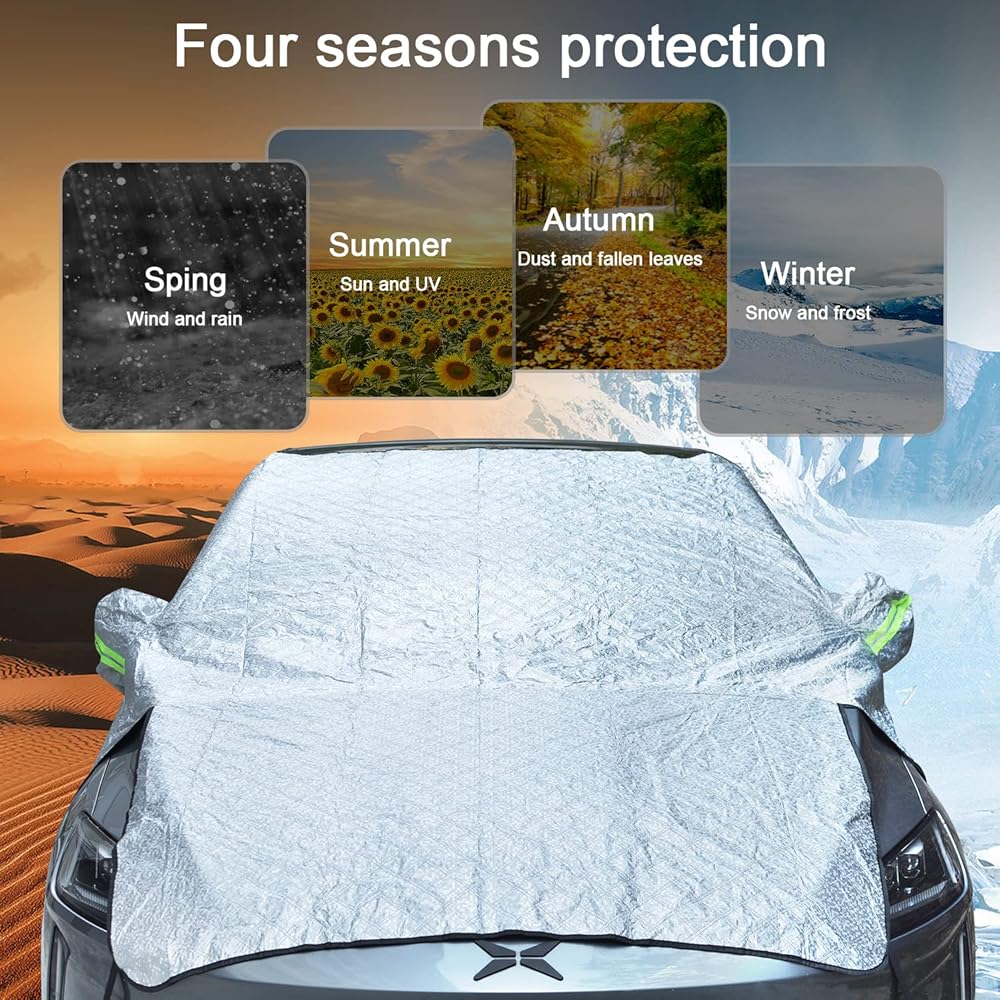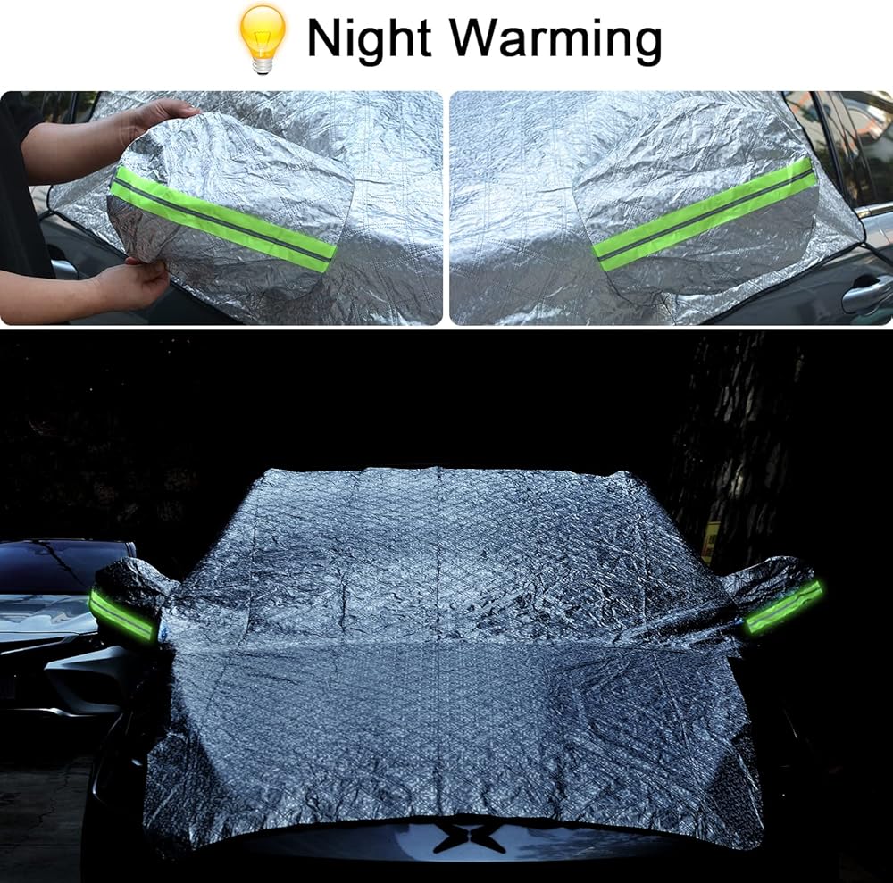 【High Quality】:Our car windshield cover has 7 layers, which contain PEVA impermeable Aluminum foil, Reflective flame retardant silver coating, Composite waterproof layer, Insulation sealing layer, Aluminum film straight cotton, Thermal insulation air cotton, Soft lacquer lining. Its surface is very soft, and these materials also make it scratch proof, water proof, stain resistant and flame retardant.