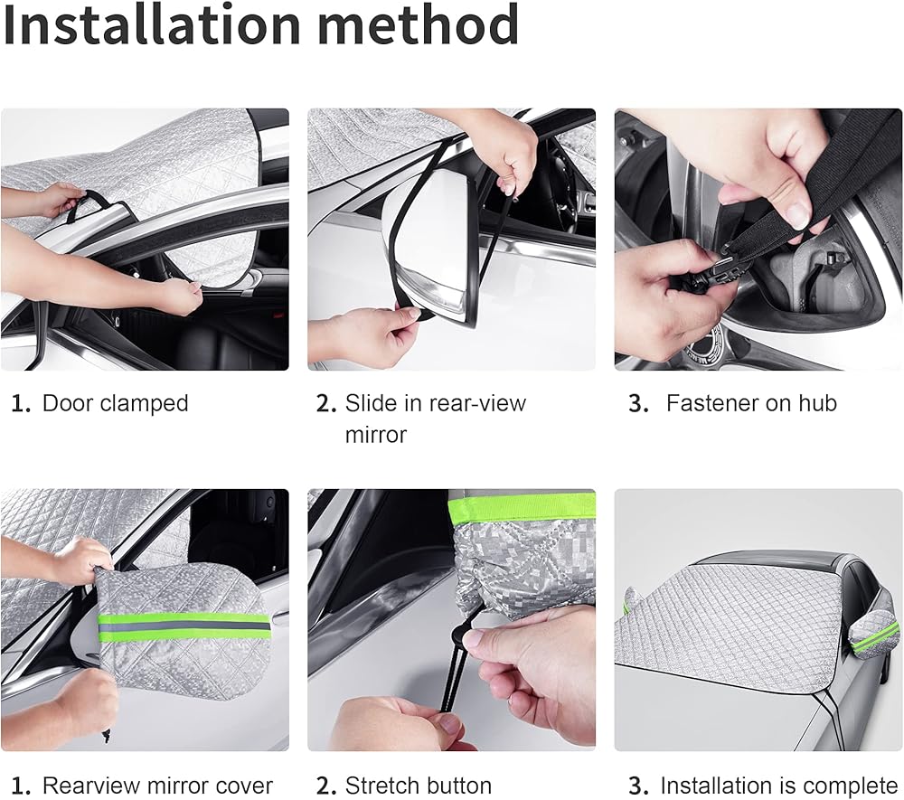 Easy to Use: The windshield sun shade and snow cover has two small wings with which you can pinch it in the car door. Two side elastic straps on the wheels to secure the cover under windy conditions.