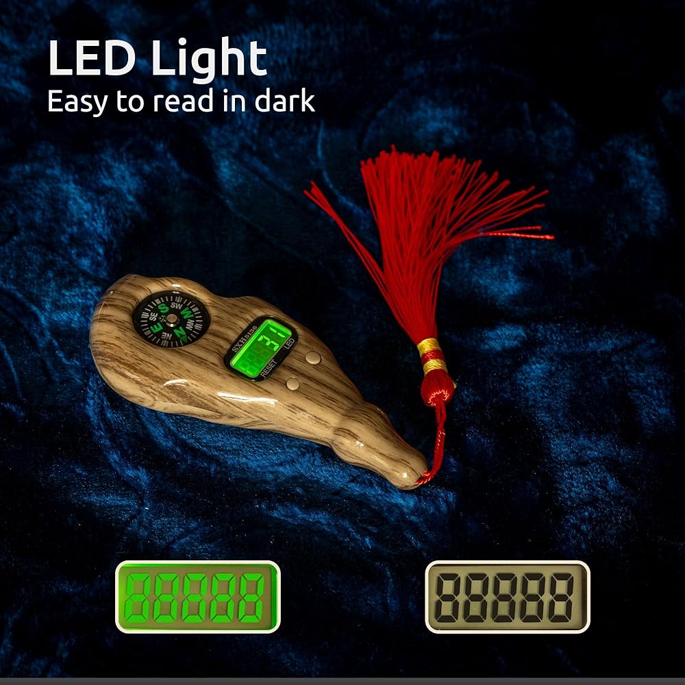 Digital Tasbih with Built-in Compass and Night Light: Our Digital Tasbih combines the traditional essence of prayer beads with modern technology. The built-in compass provides accurate guidance for determining the Qiblah direction, making your prayers more focused and aligned. The night light function, located on the side, ensures clear visibility of the bead count, even during nighttime prayers.