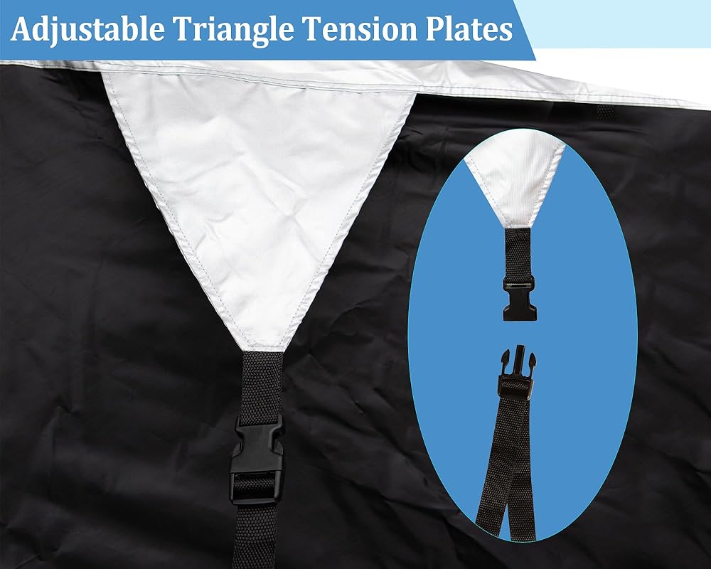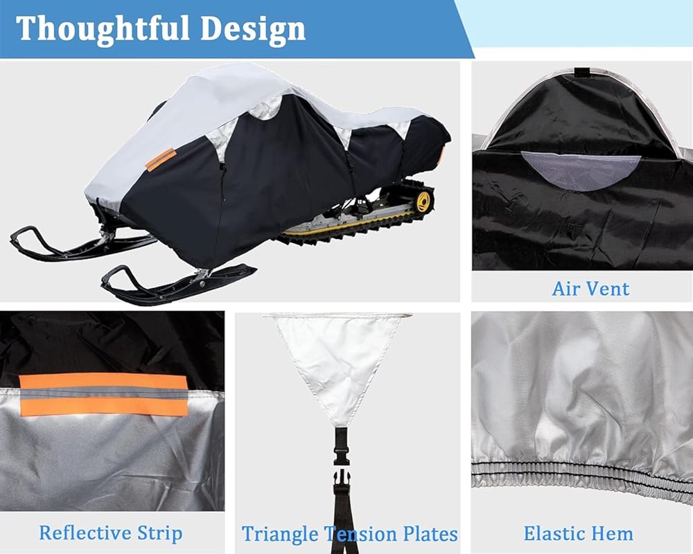 【ELASTIC HEM & TRIANGLE TENSION PLATES】 For resist the windy weather, the front and rear elastic hem makes the snowmobile cover a snug fit, and There are 3 triangular tension plates on the left and right sides each with adjustable windproof straps to wrap the snowmobile machine cover on the sled, the triangular structure reduces the tension caused by strong winds.