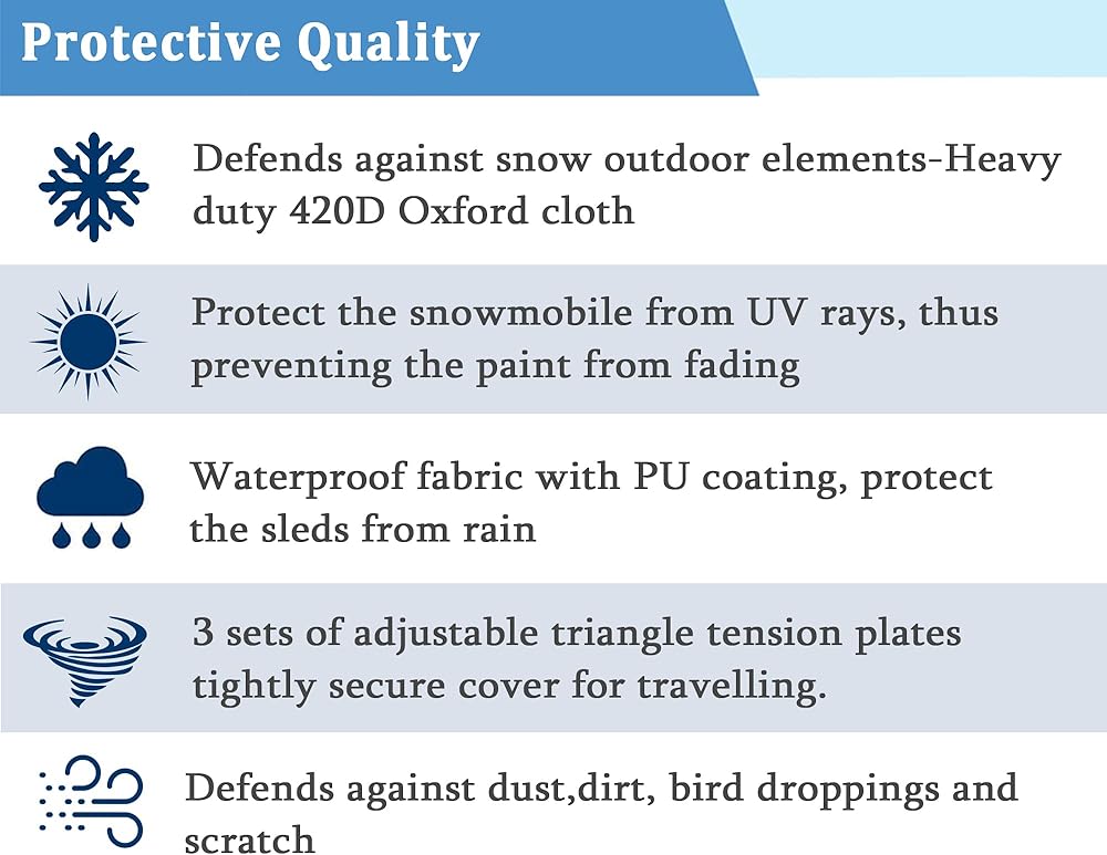 【SUPER WATERPROOF】The snowmobile cover is made of high quality oxford cloth with a water-resistant PU coating on the inner layer. The thick fabric and water-resistant coating provide unparalleled waterproof performance.