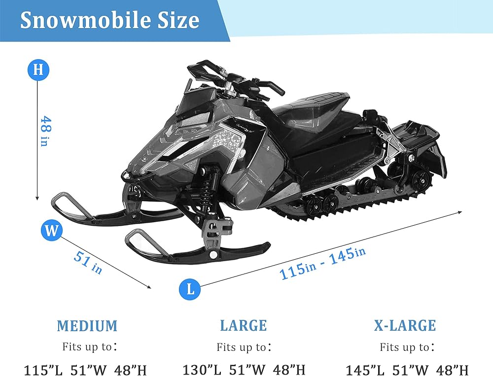 【UNIVERSAL FIT】The X-large size snow storage cover of 145''x51''x48'' fit most snowmobile, compatible with ski-doo, polaris, arctic cat, yamaha. Note: If your sleds is not listed, please measure the size or contact us before ordering.
