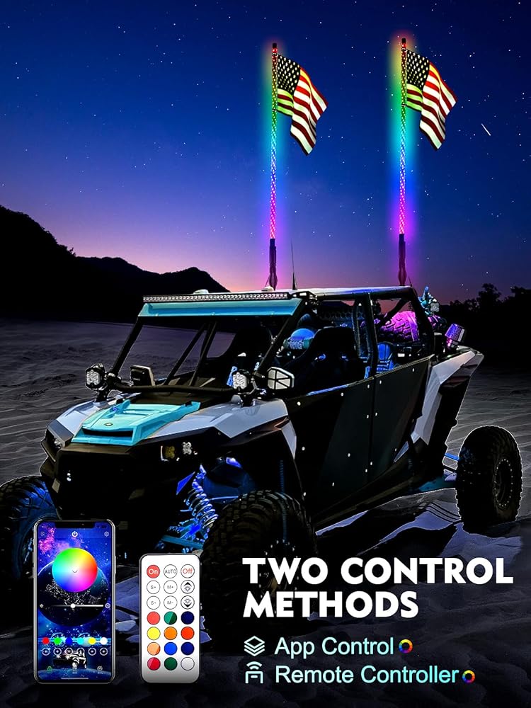 𝐖𝐢𝐝𝐞 𝐀𝐩𝐩𝐥𝐢𝐜𝐚𝐭𝐢𝐨𝐧𝐬 & 𝐄𝐚𝐬𝐲 𝐈𝐧𝐬𝐭𝐚𝐥𝐥𝐚𝐭𝐢𝐨𝐧: AUDEXEN RGB whip lights fit for Jeep, ATV, UTV, Off-Road, 4 Wheeler trucks, Go Kart, RZR, Can-am, Polaris, 4X4 Sand Dune Buggy, Sand Rail, motorcycle and Boat, etc,. Wiring is needed (Blue wire is turn signal, red wire is brake light, black is negative and white is rgb function). But the installation is simply, first connect the spring to the whip light, mount the whip light with spring base on a 12mm hole, tighten it with the provided nut, connect the whip light to the controller wire, connect it to the power sources and it is done.