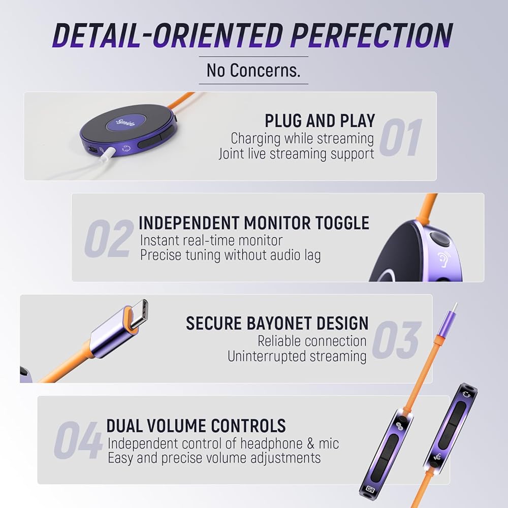 ✔️[High quality sound & Low latency performance] Our portable audio interface for phone & computer recording features studio-grade 24-bit 48kHz resolution to capture every note, chord and nuance of your performance. Dual core chip and sound processing system let you experience pristine audio quality and say goodbye to distracting delays.