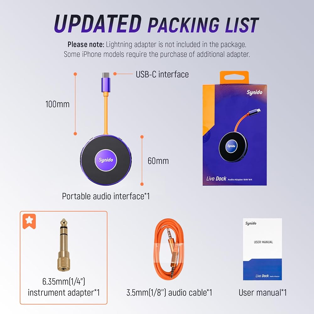✔️[Designed for players] This mini audio converter is a good helper for internal recording of musical instruments, with ultra-clear internal playback and internal recording function. In order to facilitate users to connect instruments, the package is equipped with a 6.35mm (1/4'') instrument adapter. You can unleash your talents to your heart's content~ The specific package list can be found in the picture. Please note: Lightning adapter is not included in the package.