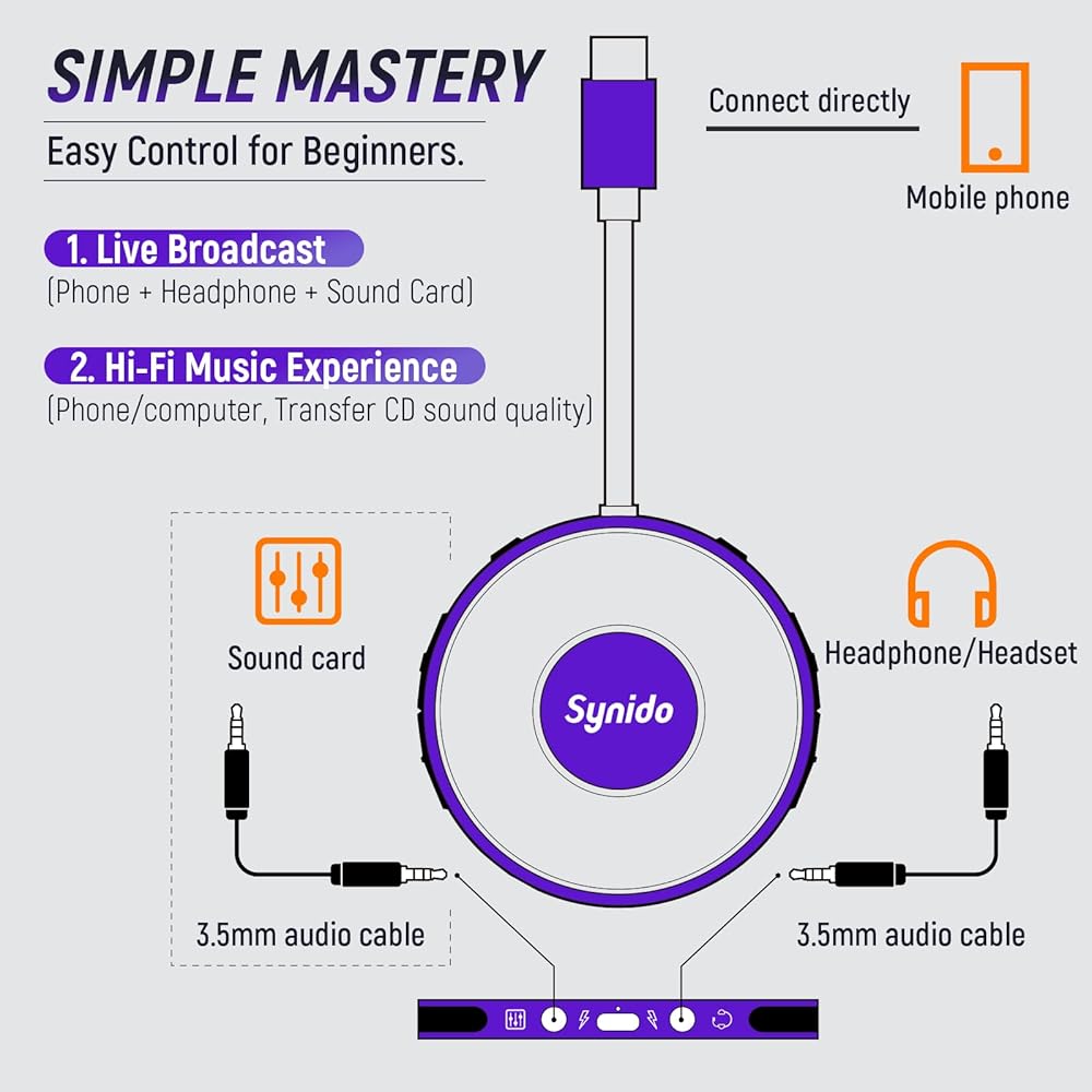 ✔️[Charging while broadcasting] Synido audio interface is a portable sound card and audio converter that is more suitable for mobile live broadcasts. It comes with a USB-C interface that can be directly connected to a mobile phone or a computer. Meanwhile, as a docking station, it can connect a charging cable to charge the mobile phone during mobile live broadcasts, you can live broadcast for as long as you want.