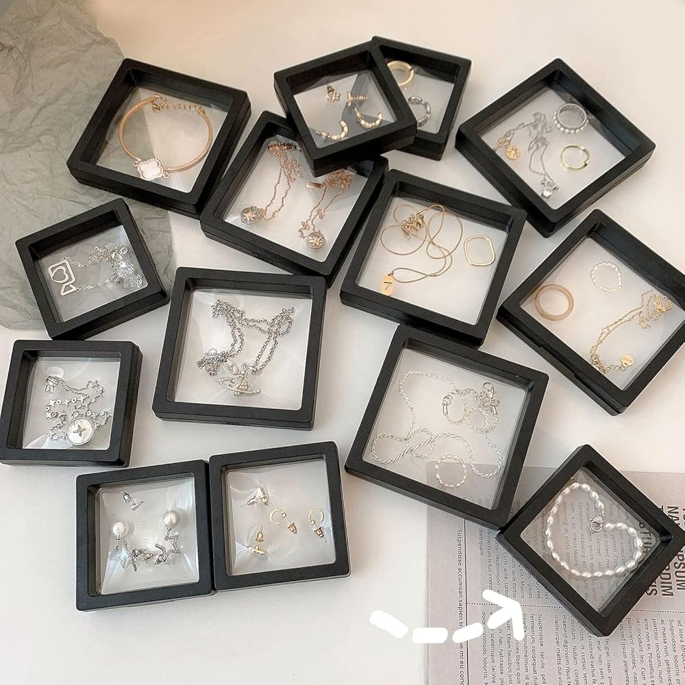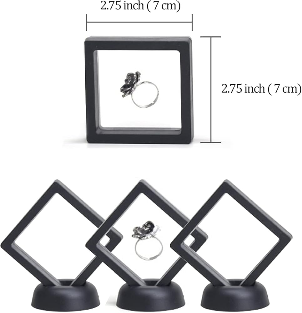 2.75" Square Floating Frame >> Square display frame with a 2.2' base, there are two transparent elastic thin films in the middle to fix the display item
