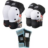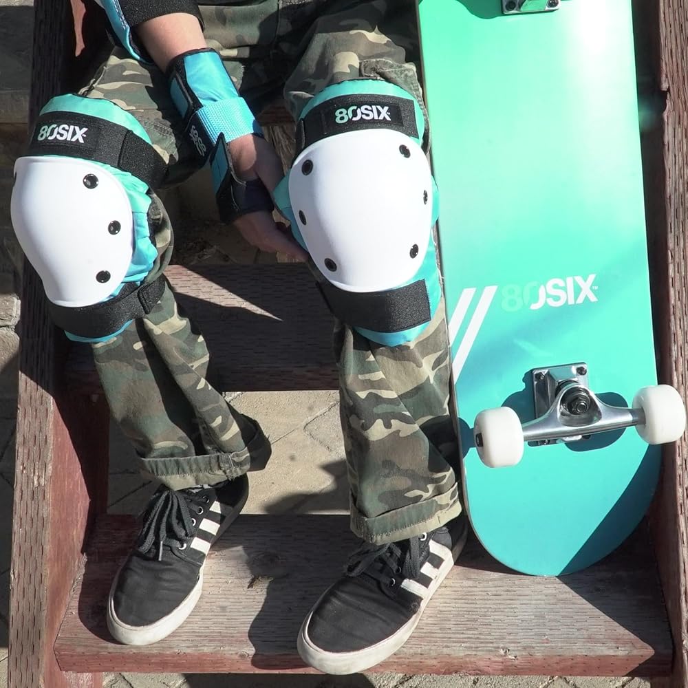 High-density, impact-resistant caps are securely anchored with reinforced rivets for maximum protection; Wrist guards, elbow pads, and knee pads have top and bottom adjustable straps for a secure fit