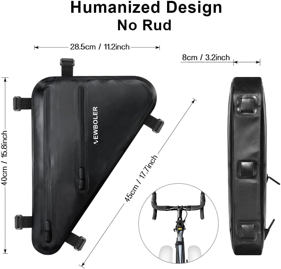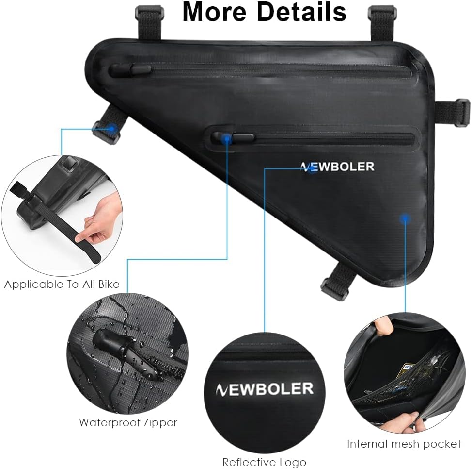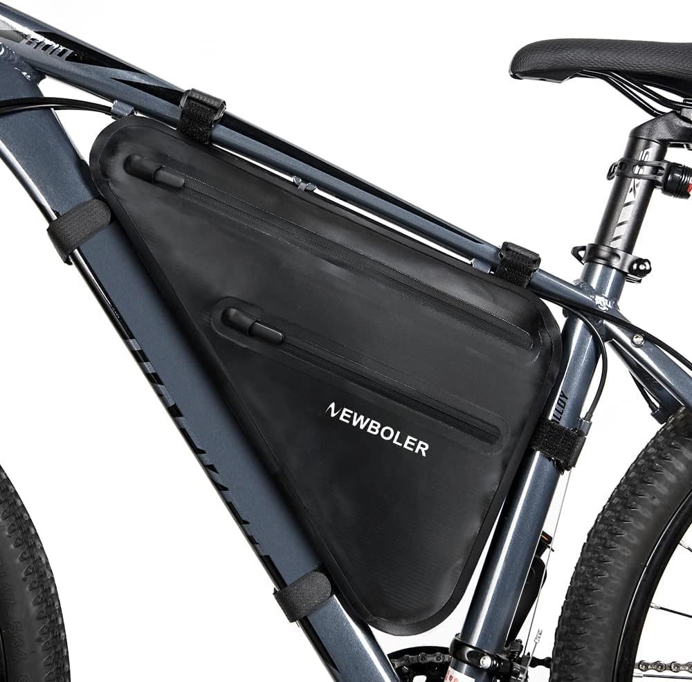 Portable Triangle Bag: NEWBOLER top tube bike bag with the help of 5 adjustable velcro, it can easily help you fix it on the front frame of the bicycle. Even if you ride on uneven mountain roads, it will not shake around and cause you trouble. The bicycle frame bag will help you to ride happily.
