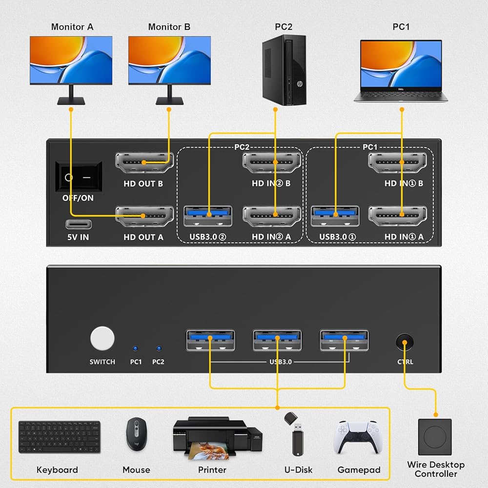 【8K KVM Switch Dual Monitor】 USB3.0 HDMI Dual Monitor KVM Switch supports the highest resolution 8K@60Hz. Compatible 4K@144hz/120Hz, 2K, 1080p, etc. Note: We recommend using high-quality HDMI2.1 cables to achieve 8K@60Hz .