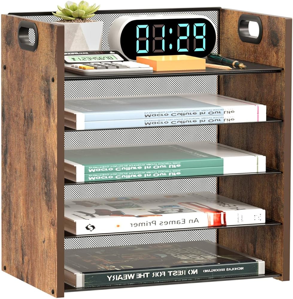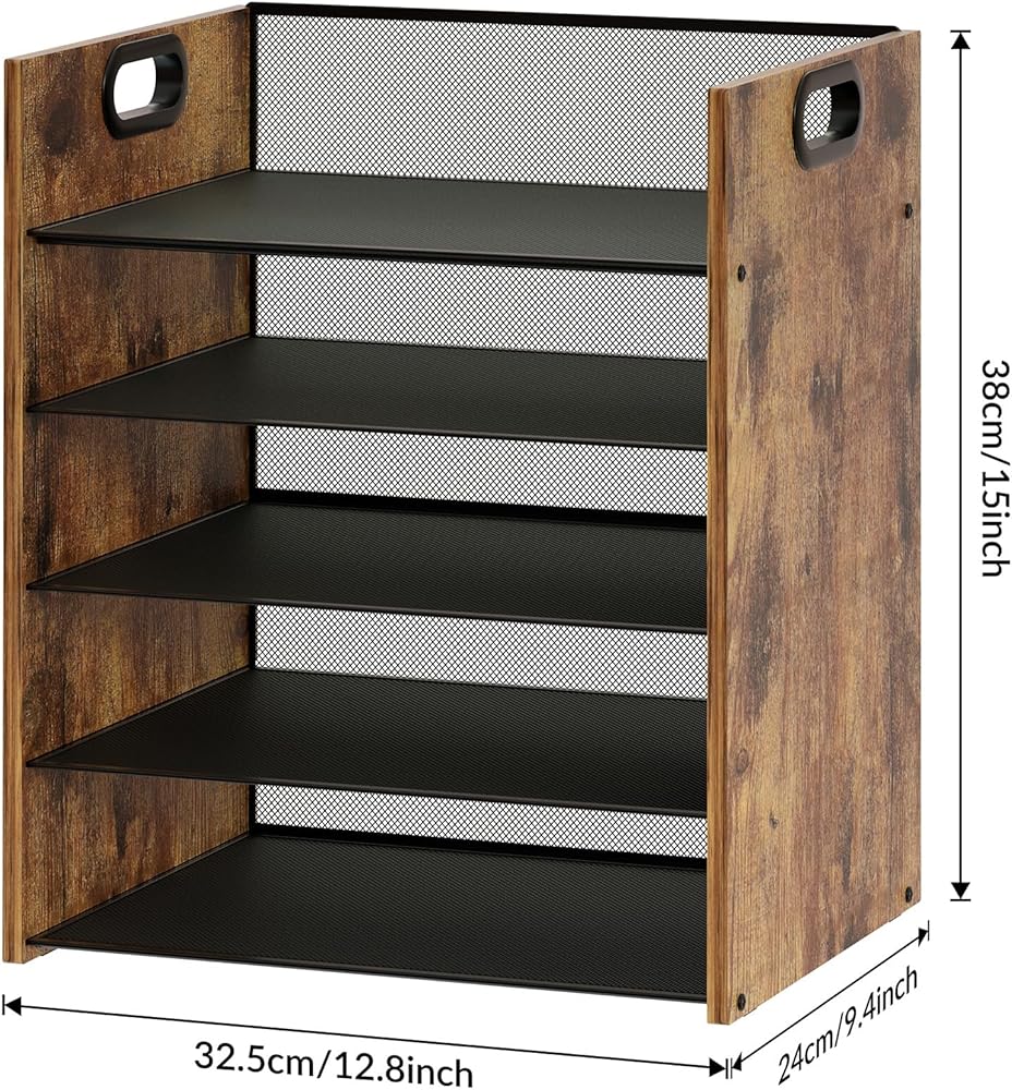 5 Tier Wood Paper Organizer for Desk, Metal Office Organizer and Accessories with Handle, Mesh File Holder for Desk, File Cabinets for Home Office, School