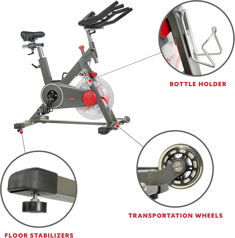 Experience the ultimate fitness journey with the SF-B1805 and SF-B1805SMART Magnetic Indoor Cycling Bike by Sunny Health & Fitness. This advanced smart fitness bike offers a high-intensity cardio workout with multi-hand grips and support for high-interval training. Its magnetic resistance system ensures a smooth and nearly silent ride, while the heavy-duty steel frame provides stability for users up to 300 lbs. With the 44 lbs flywheel, you can enhance your physical fitness and strength training. The bike features adjustable seat and handlebars for a personalized fit, and the integrated device holder allows you to follow workout videos. Take your workouts to the next level with the optional SunnyFit APP, connecting your mobile device via Bluetooth to track real-time performance metrics, explore worldwide maps, access customized workout plans, enjoy a library of 1000+ workout videos, and engage with the exercise bike leaderboard and fitness community.