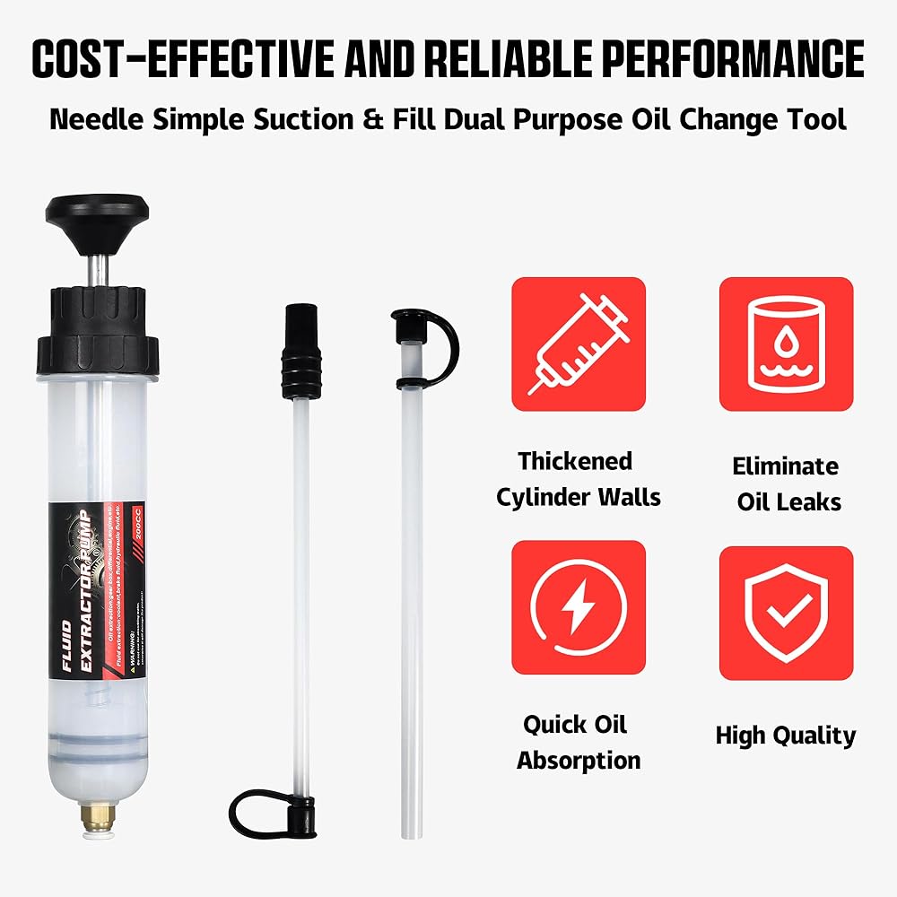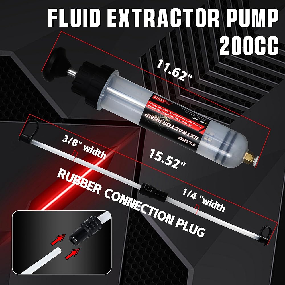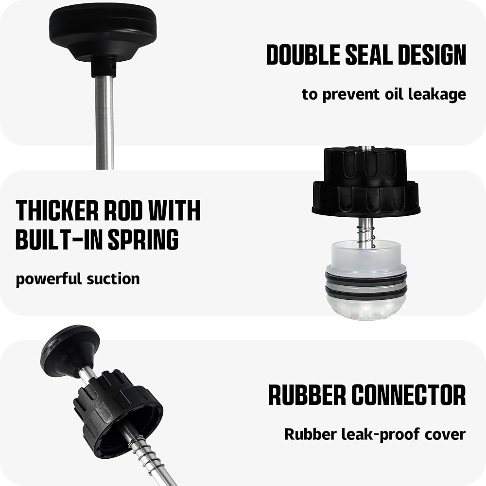 Two Extension Hoses:JMCUHYD Fluid Extractor comes with 1/4" OD and 3/8" OD extended suction hoses to help you easily pump oil from hard-to-reach locations.