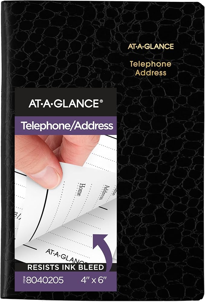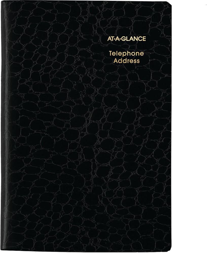 AT-A-GLANCE Designer Telephone/Address Book makes it easy to keep track of contact information for family, friends and colleagues Rich gilt edges and sleek crocodile cover give this address book fashionable flair. Single letter tabs make it easy to organize by name and quickly locate any contact. Includes room for 600+ entries. Bookbound design is sleek and stylish with crocodile pattern, simulated leather covers. Rich, gilt edged pages measure 4" x 6". Black.