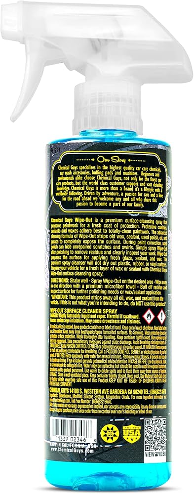 Chemical Guys Wipe-Out is the surface prep spray that strips old layers of glaze, sealant, and wax. Proper surface prep is a critical step in polishing and paint correction, and to guarantee maximum adhesion of fresh layers of vehicle coatings, sealant, and wax. Strip old layers of grease, oil, and polish with Wipe-Out to uncover the totally-pristine surface. Check polishing work to ensure no swirl or scratch was hiding underneath polish residue or old wax. Help your coatings, glaze, sealant, and wax bond stronger, look better, and last longer by properly stripping away old layers with Wipe-Out. While polishing away swirls and scratches, used polish can fill lighter defects and blemishes, making them harder to see and repair. Use Wipe-Out to remove spent polish for proper inspection of paintwork for satisfactory results. The old detailer's trick used IPA (Isopropyl Alcohol) to remove polish residue for painted panels. While the alcohol and water mixture dissolved any residue, it was not slick enough to prevent fresh swirls and scratches caused by light airborne debris or rough microfiber towels. Wipe-Out is formulated with special lubricating and anti-static agents to help prevent scratches while wiping dust or polish residue. Wipe-Out helps prevent polishing residue and dust from sticking to freshly-finished panels for reduced prep time after polishing and before a coat of wax. Prepare your car for the best look and protection with Chemical Guys Wipe-Out Surface Prep Spray.