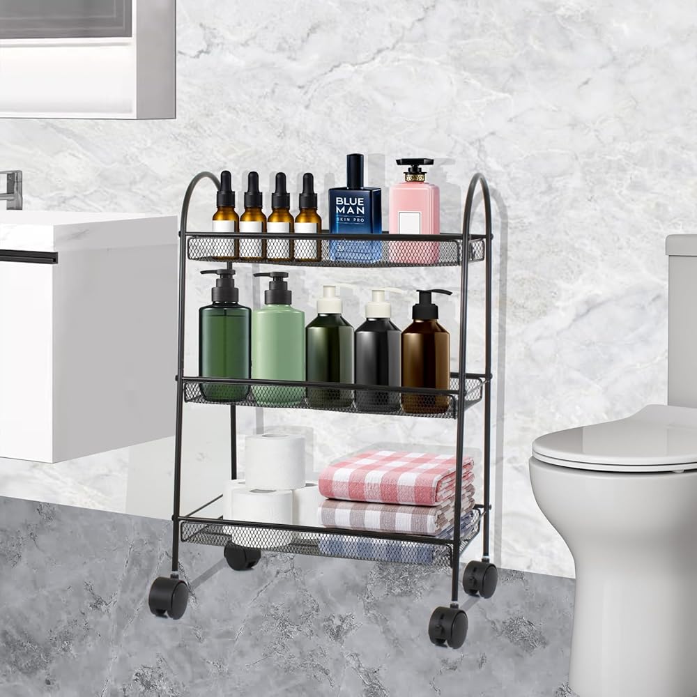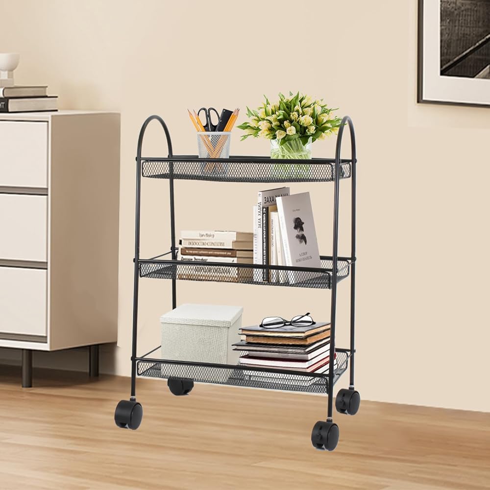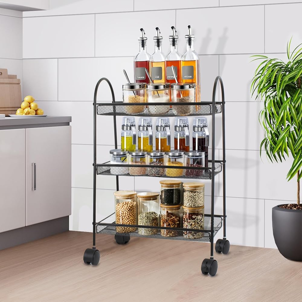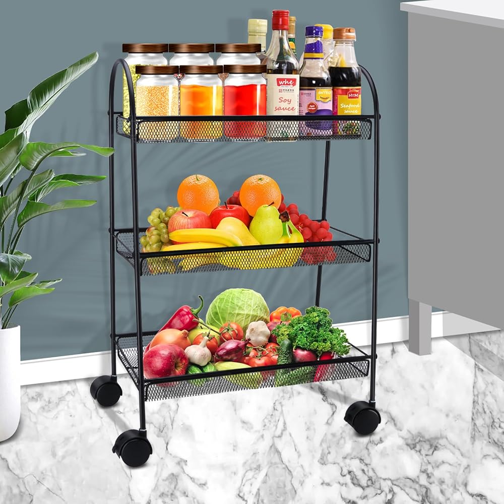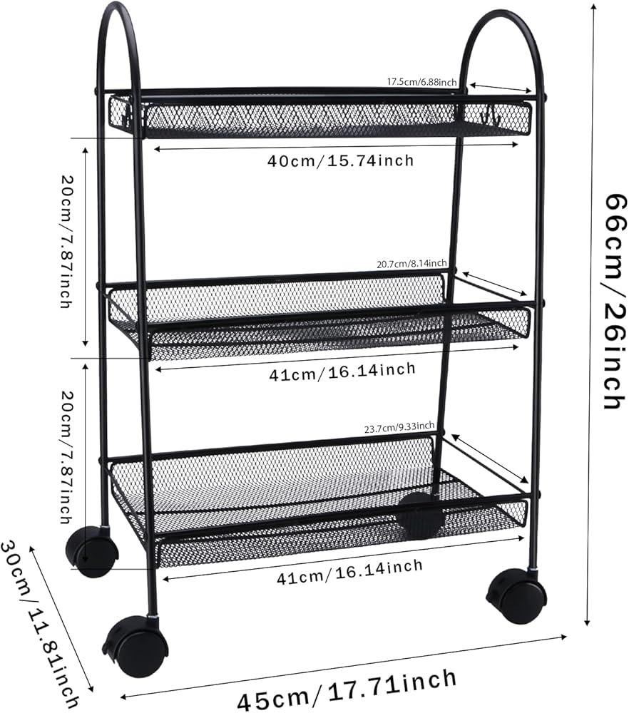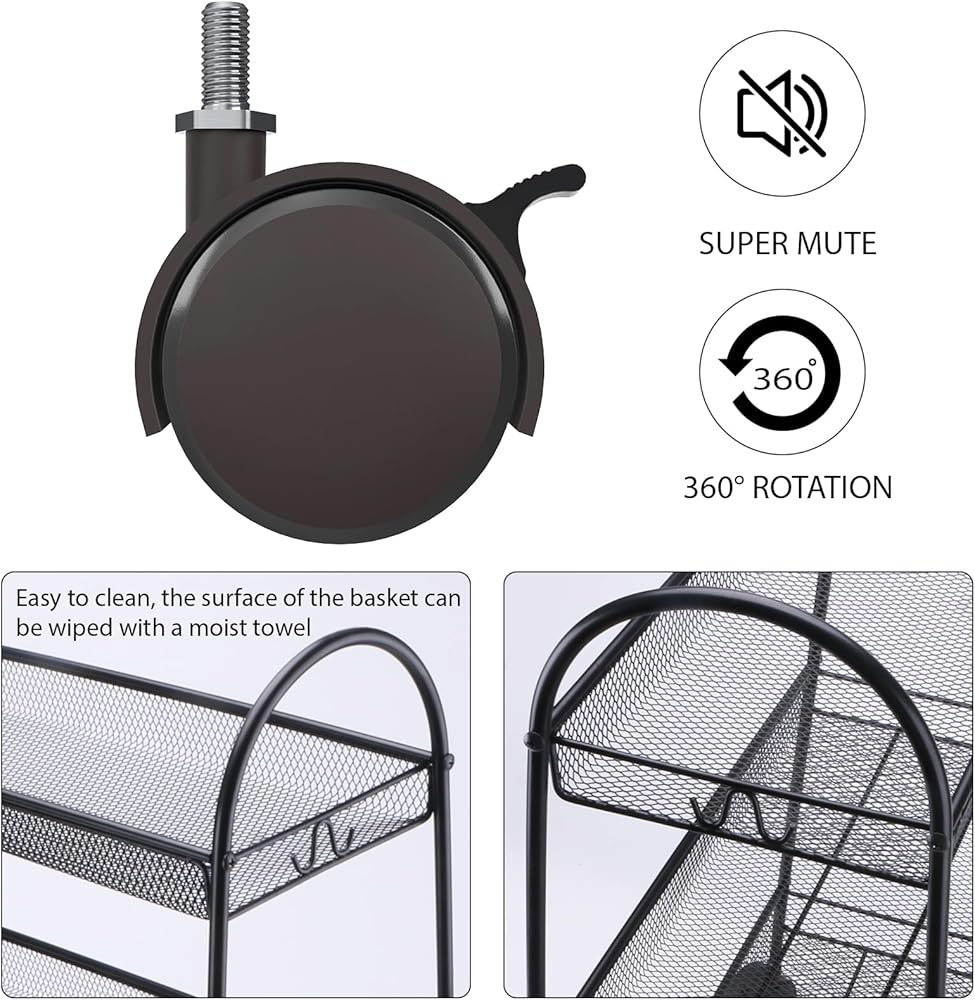 【Multifunctional Rolling Cart】: Our practical cart has multiple uses and is almost suitable for any application and any room. It can be a snack cart, tool cart, service cart, book cart, or organizing rack in the kitchen, bedroom, laundry room, bathroom, living room, office, garage, and workshop.【360 ° wheels that can be moved or locked at will】:Our storage cart is equipped with 4 360° rotating wheels, easy to carry around and change place at will, two of wheels are lockable, provide stability. The modern curved handles design makes it more convenient to push and pull around as needed.【A practical and exquisite metal rolling car】:Simple and stylish appearance, matching all rooms; Metal material, solid and durable; Mesh basket design allows air to flow, and water accumulation won't be a problem. The surface is subject to anti-rust treatment and painting to achieve double protection. Precise connection process make the cart more exquisite.【Ventilation grid kitchen car】:Each steel wire frame of the practical storage vehicle is 2.4 inches high, which can safely store circular items such as fruits, vegetables, and canned food. The metal mesh allows for air circulation, keeping your storage dry and fresh.【Easy assembly】:The accompanying instructions make assembly quick and easy in just a few minutes. Simply connect the storage cart legs with screws and insert the wheels to complete the installation