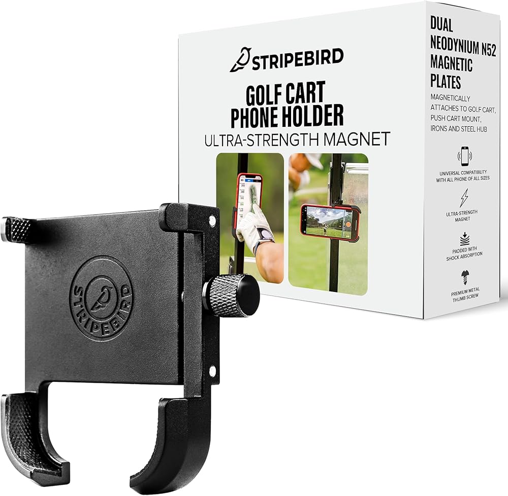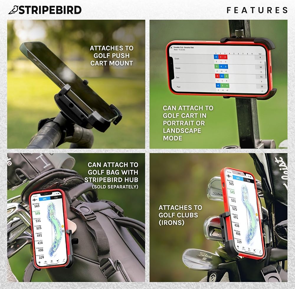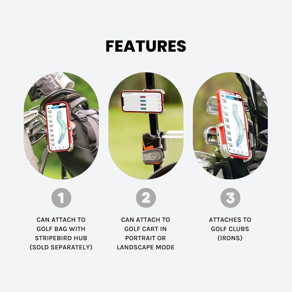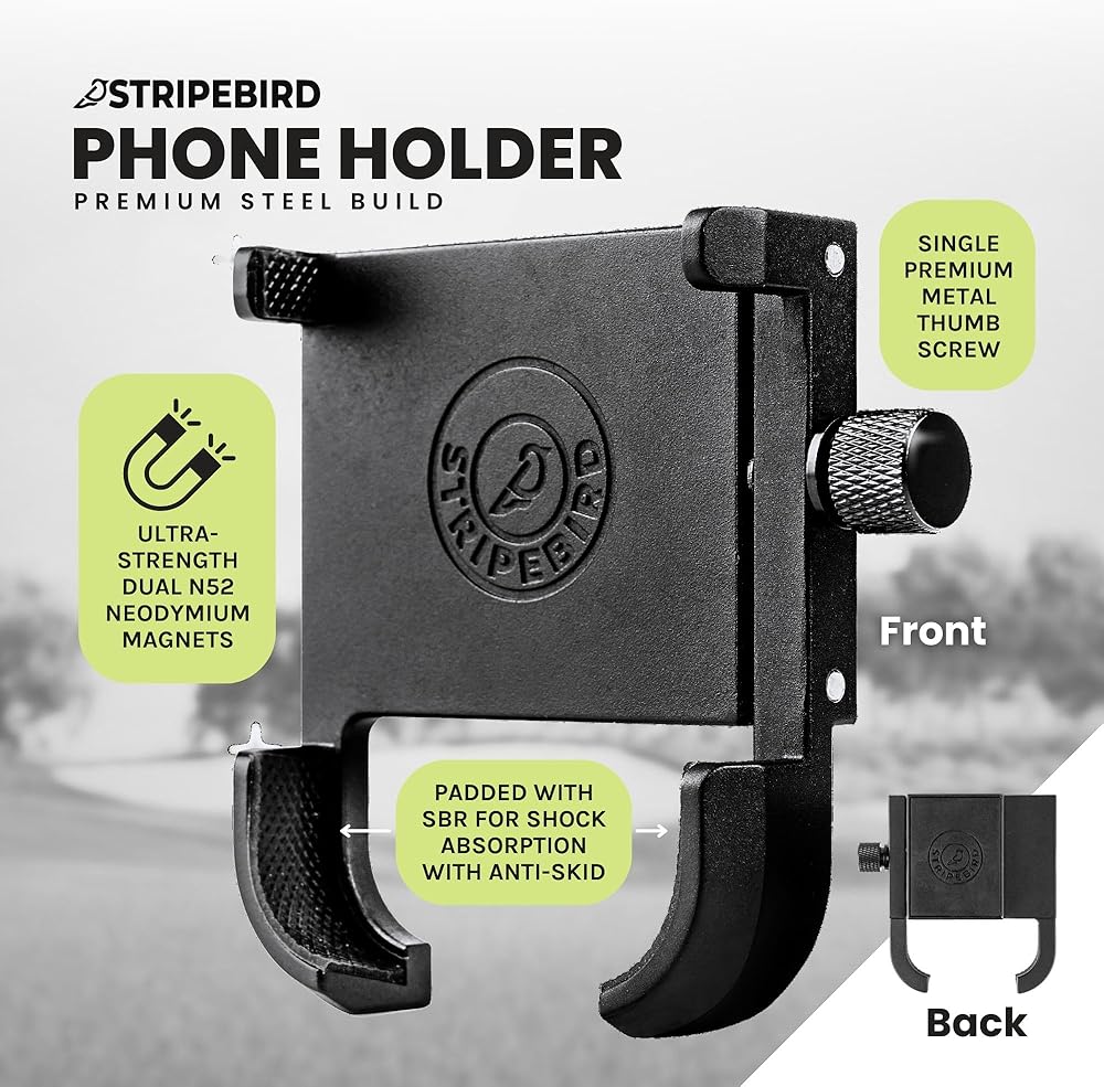 ✔ NO INSTALLATION REQUIRED: Just insert the phone into the Phone Holder, tighten with metal thumbscrew for a snug fit. Then stick it onto a metal surface such as the golf cart, golf irons or Stripebird Hub (sold separately). It is rugged enough to keep in the golf bag and comes in a premium dust bag for easy and safe storage.