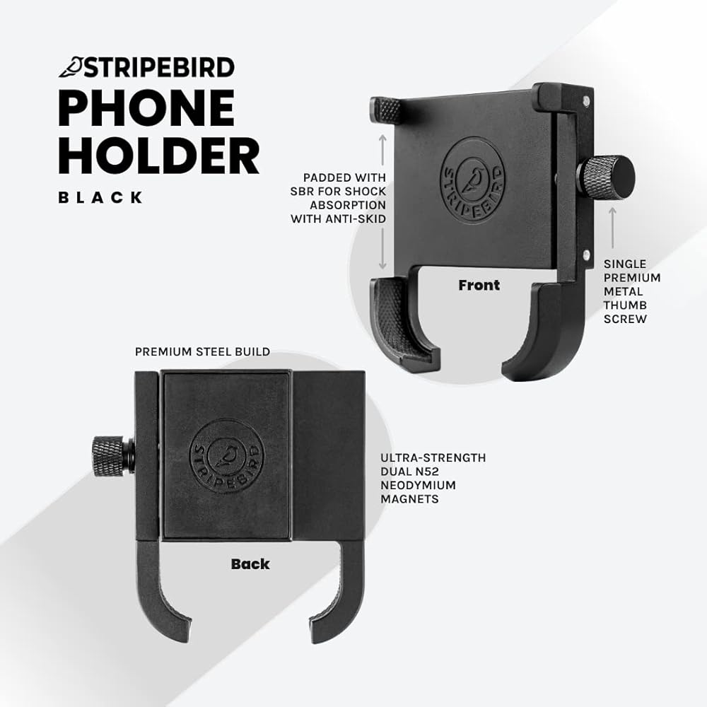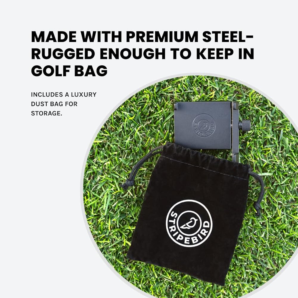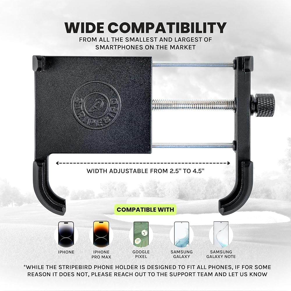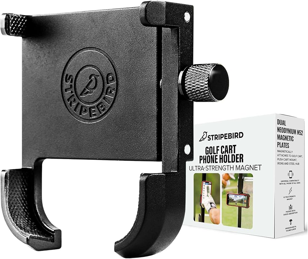 ✔ NO INSTALLATION REQUIRED: Just insert the phone into the Phone Holder, tighten with metal thumbscrew for a snug fit. Then stick it onto a metal surface such as the golf cart, golf irons or Stripebird Hub (sold separately). It is rugged enough to keep in the golf bag and comes in a premium dust bag for easy and safe storage.