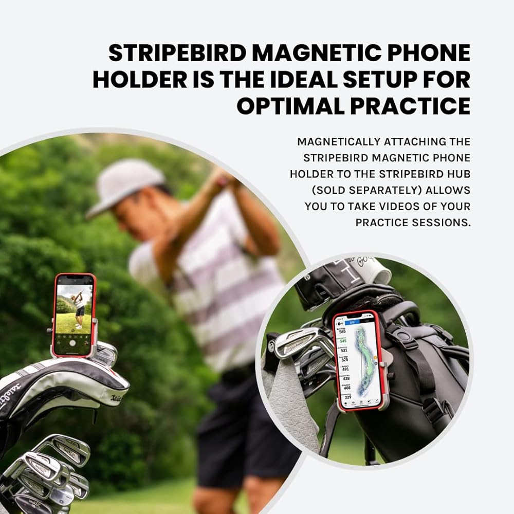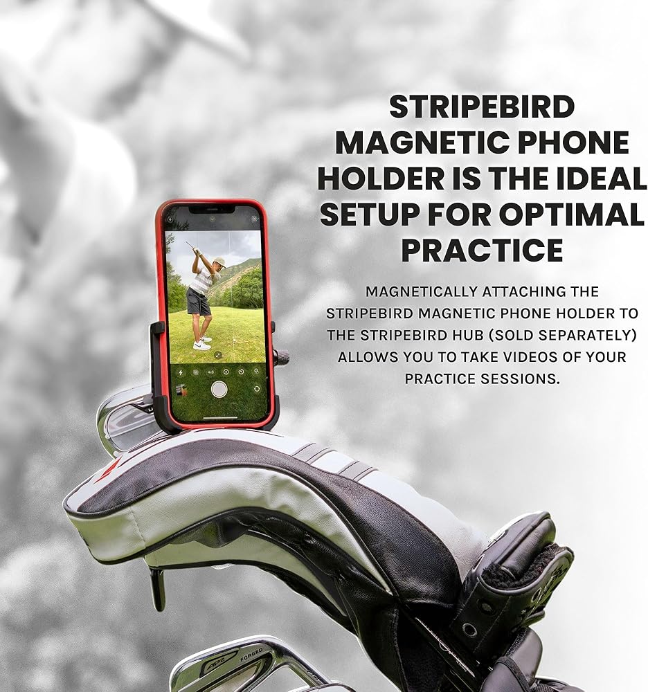 The US Patent-Pending, Original Golf Magnetic Phone Holder is the ultimate golf accessory to store and keep your smartphone accessible during your round or on the range. It is magnetically attachable onto golf carts, golf irons and the Stripebird Hub (sold separately). It uses dual neodymium N52 magnet plates to withstand the bumpiest of rides on the cart while giving you free and unfettered access to your smartphone. No more leaving your phone in the cup holder, on the seat or in your pocket. On the course, your smartphone can now remain visible and accessible at all times. Record your score, check the GPS app and never miss an important text or phone call. It also allows you to autonomously capture your swing from down-the-line or face-on for swing analysis and improvement in both portrait and landscape mode. The Magnetic Phone Holder has an ultra-slim profile and structure to fit all types of smartphones. It is expandable in width from 2.5 in to 4.5 in to fit any phone and keeps the camera exposed for photo and video in both portrait and landscape mode.