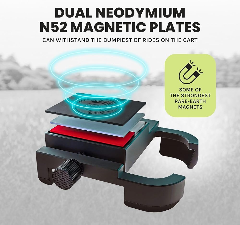 ✔ US PATENT-PENDING WITH MAXIMUM STRENGTH HOLD: The Original Golf Magnetic Phone Holder is magnetically attachable onto golf carts, golf irons and Stripebird Hub (sold separately). It uses dual Neodymium N52 magnet plates (some of the strongest rare-earth magnets).