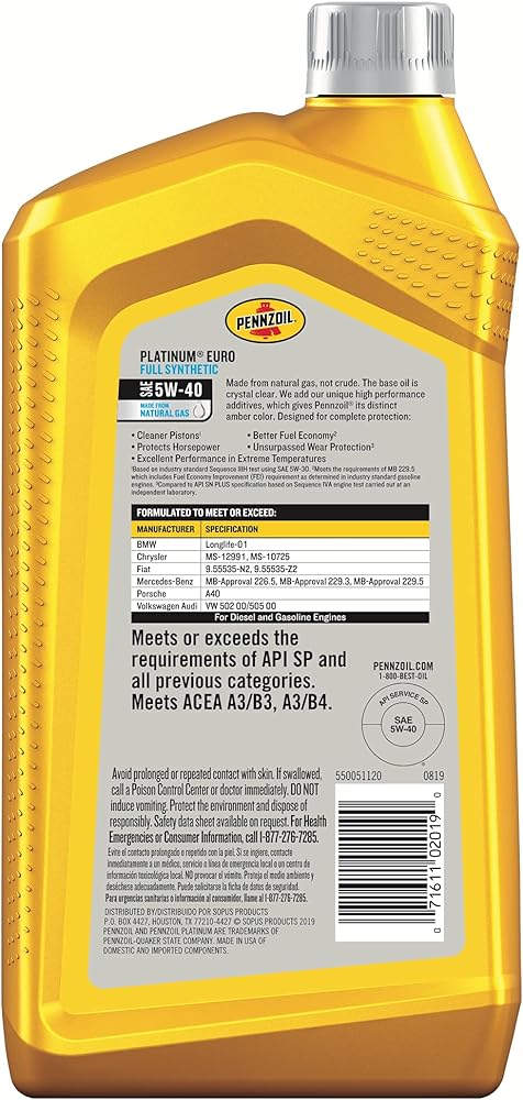 Pennzoil Platinum Euro 5W-40 Full Synthetic motor oil is made with natural gas and designed for complete protection for modern light-duty diesel and high-performance engines in European vehicles. Pennzoil Platinum Euro 5W-40 Full Synthetic motor oil helps extend engine life and protects for up to 15 years or 500,000 miles, whichever comes first, guaranteed*. Pennzoil Platinum Euro far exceeds the most stringent car manufacturer requirements for cleanliness and protection based on Mercedes-Benz, VW, and Porsche specifications. It provides superior wear protection (based on Sequence IVA and Sequence VIII engine tests carried out in an independent laboratory), superior piston cleanliness up to 45% cleaner (based on DV4TD vs. ACEA C2/C3 using SAE 0W-30), and better fuel economy for up to 2.6% (based on ACEA M111 fuel economy results vs. the industry reference oil). Exceeds the following industry requirements: API SN and all previous categories; ACEA C2, C3. Meets or exceeds the requirements of the following OEM specifications: Mercedes-Benz MB-Approval 229.31, MB-Approval 229.51, MB-Approval 229.52; Porsche C30; Volkswagen 504 00/507 00. For a full listing of equipment approvals and recommendations, please consult your local Shell Technical Helpdesk. (*Pennzoil Platinum Lubrication Limited Warranty: Up to 15 years or 500,000 miles, whichever comes first, guaranteed, if you exclusively use Pennzoil Ultra Platinum Full Synthetic motor oil, Pennzoil Platinum Full Synthetic motor oil, Pennzoil Platinum Euro Full Synthetic motor oil, and Pennzoil Platinum High Mileage Full Synthetic motor oil. Your engine must have less than 125,000 miles and been manufactured in the past 72 months. To maintain your warranty, change your vehicle's oil and oil filter at least as often as recommended by the vehicle manufacturer. Enrollment required. Keep your receipts. Other conditions apply. See Pennzoil.com/warranty to enroll and for full details and terms.)