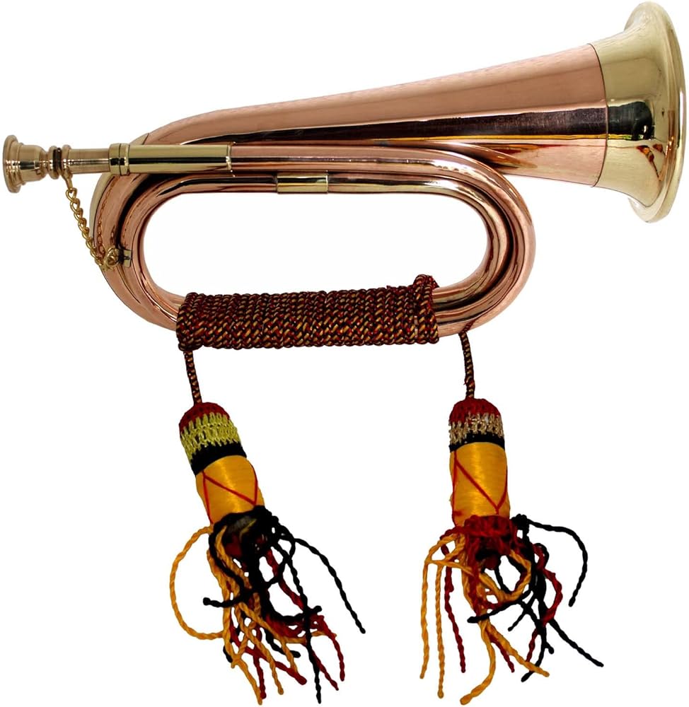 CAVALRY BUGLE CIVIL WAR WITH COPPER AND BRASS FINISH MUSICAL INSTRUMENT, Description:- This is a functional bugle just like the ones that signaled troops in the field during the Civil War and the battles of the frontier against warring Indian tribes. This US Civil War Bugle is made of brass and carries the Union insignia. Short History: The bugle is one of the simplest brass instruments, having no valves or other pitch-altering devices. All pitch control is done by varying the player's embouchure. Consequently, the bugle is limited to notes within the harmonic series. See bugle call for scores to standard bugle calls, all consisting of only five notes. These notes are known as the bugle scale.