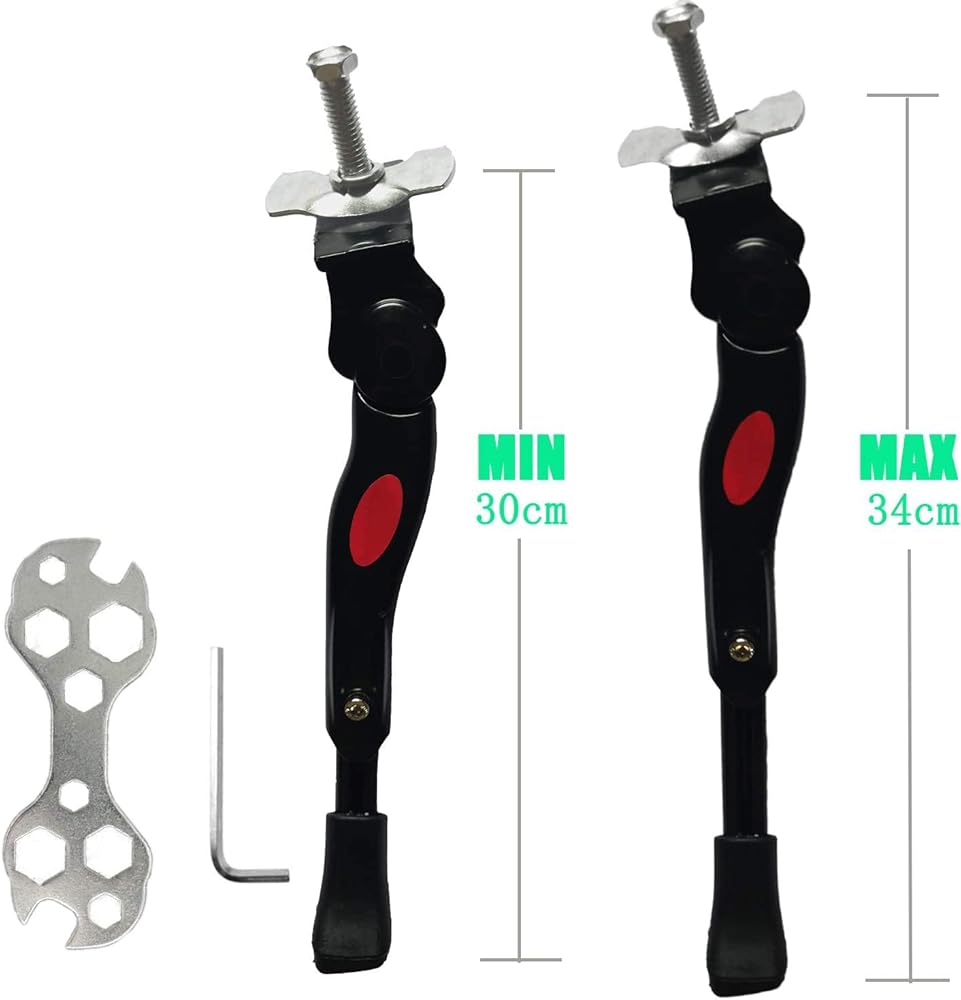 Kickstand for Kids Bike, Adjustable Bicycle Kickstand Feature: Stable & Anti-skidding: Made of strong and durable Aluminum Alloy with anti-slip pad, can prevent the bicycle from slipping on wet surfaces. Suitable:This bike kickstand fits for 16" 18" 20" 22" Mountain Bike/kid adult bike/road bicycle/sport bike. High Quality: Made of aluminum alloy material, with top quality and very strong,Waterproof Anti-rust and wear-resisting, durable to use. Length adjustable: This bike kickstand with wrench to loosen the middle of screw, length can be adjustable between 7.6”-9.6”inch(250-320mm). Convenient: It makes your bicycle convenient to parking. Package Contents: bike kickstand * 1, Long bolt *1, Metal bracket x*1, wrench * 2.