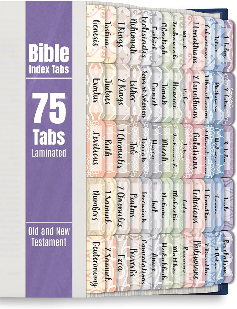 Better Office Products Bible Tabs, Old and New Testament, 75 Laminated Bible Index Tabs (66 Book Names + 9 Blanks), Christian Bible Journaling Adhesive Tabs (Harmonious Themed Backgrounds)