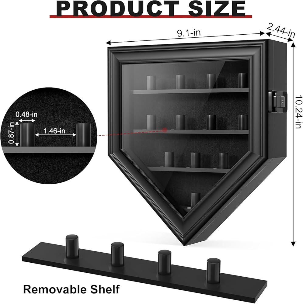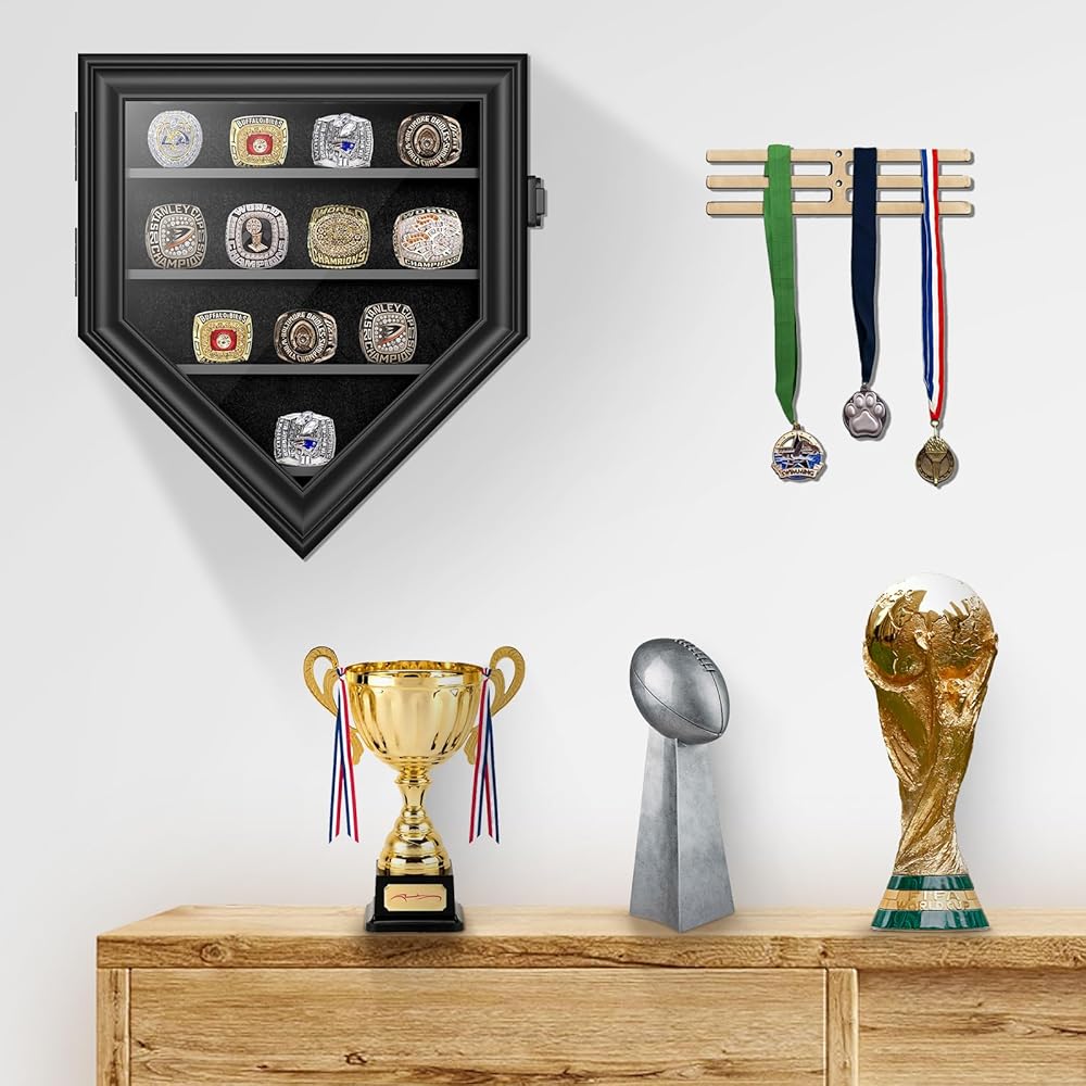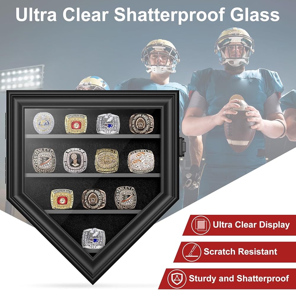 [Meticulously Crafted Design] The ring case features 12 premium black acrylic baseball ring holder, complemented by a sophisticated black velvet background and gold-plated anti-theft lock. These elements combine to offer secure, stable display space for championship rings, resulting in a visually striking presentation.