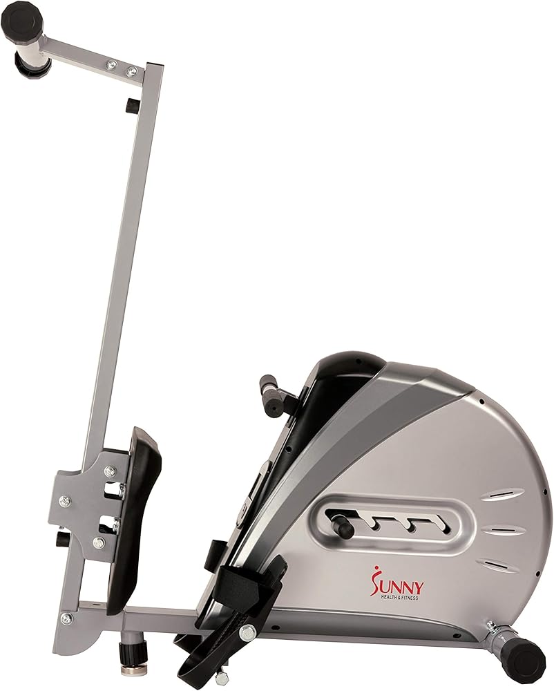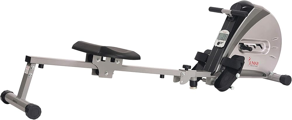 The Sunny Health & Fitness SF-RW5606 Elastic Cord Rowing Machine provides an outstanding way to increase fitness by burning calories and building muscle in a safe, low-impact way. Made of top-grade steel, this ultra-smooth and quiet rower features an elastic cord resistance with 4 levels of adjustable tension which makes it the perfect addition to your home gym. It comes equipped with large any-slip pedals with straps and an easy-to-read LCD monitor which displays Time, Calories burned, Count, Total Count, Count per minute, and Scan. Featuring the option to fold; the Sunny Health & Fitness Elastic Cord Rowing machine is very portable and can easily be stored away. Maximum user weight 220 lb.