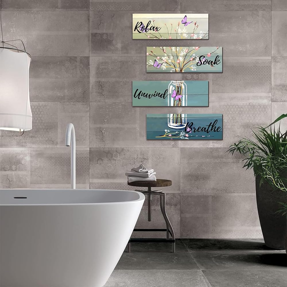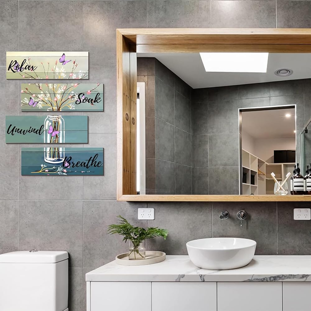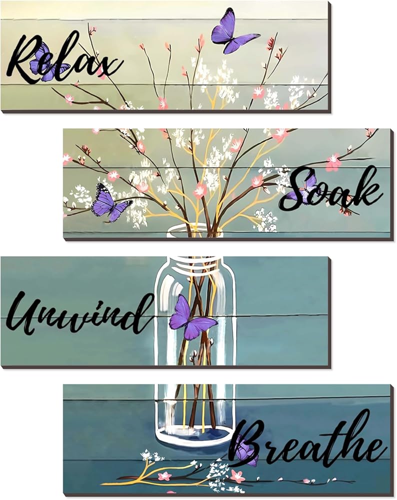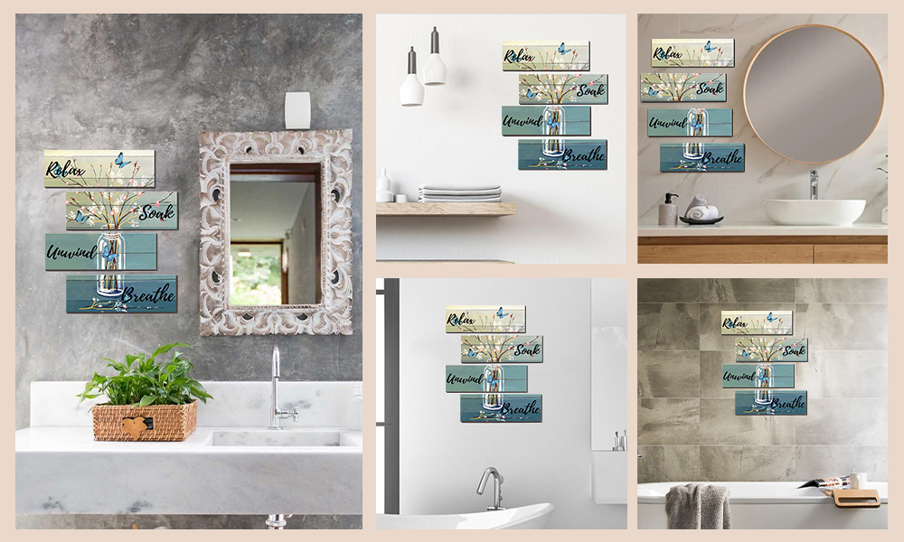 Elegant Bathroom Decor: Printed with "Relax," "Soak," "Unwind," and "Breathe" signs, this decor also includes beautiful bottles, flower arrangements, and a blue butterfly pattern, making it both rustic and elegant.