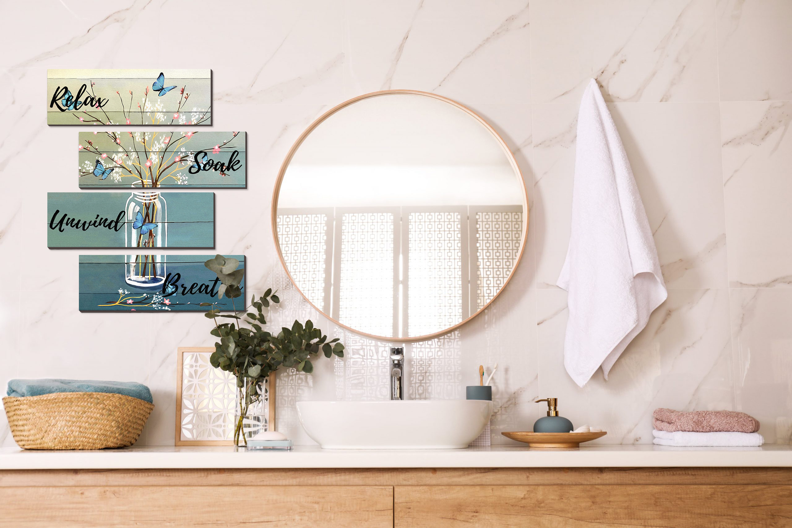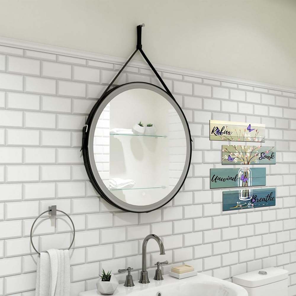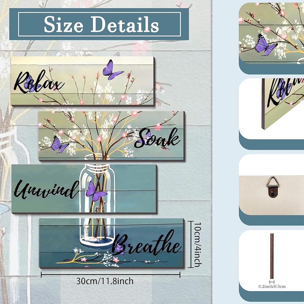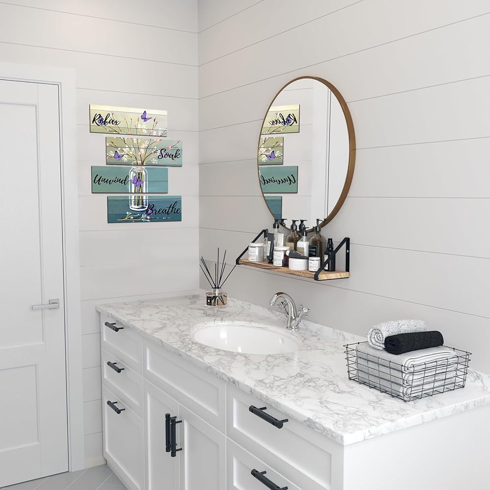 Elegant Bathroom Decor: Printed with "Relax," "Soak," "Unwind," and "Breathe" signs, this decor also includes beautiful bottles, flower arrangements, and a blue butterfly pattern, making it both rustic and elegant.