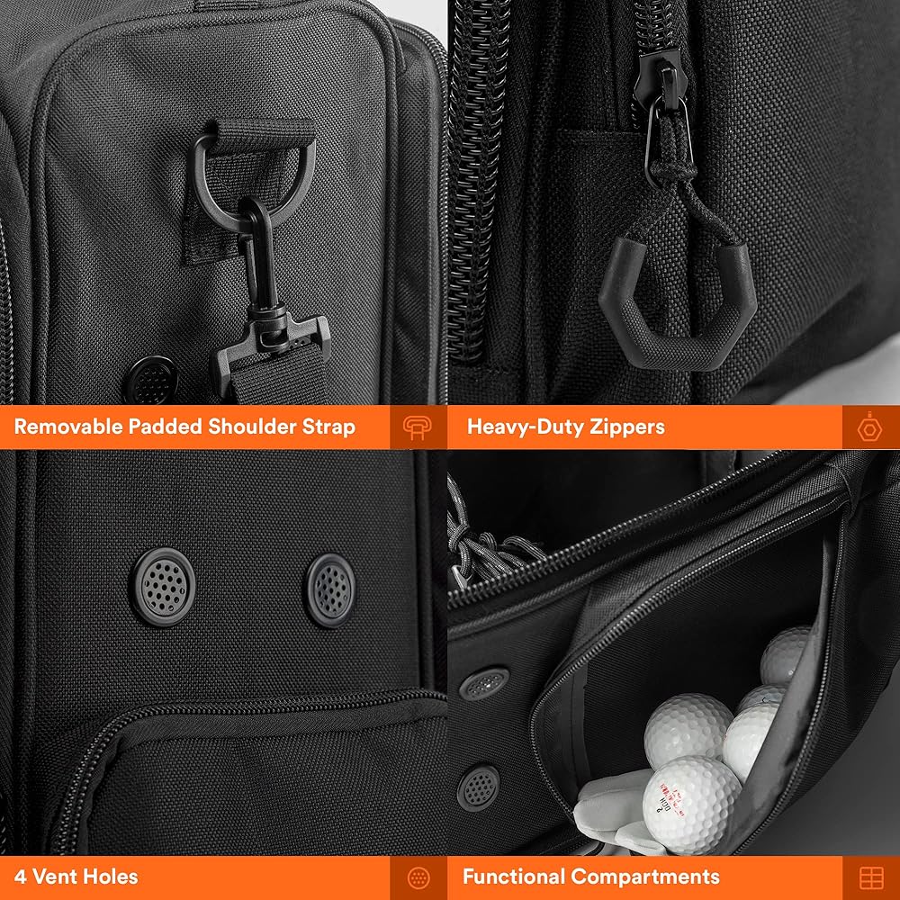 STAYED ORGANIZED WITH 5 COMPARTMENTS - Keep all your golf needs and organized in one bag. From your keys, phones, hand sanitizer to balls, tees, brush, spare cleats, wrench and rags. It has a pocket for everything so you don't have to waste time looking for them.