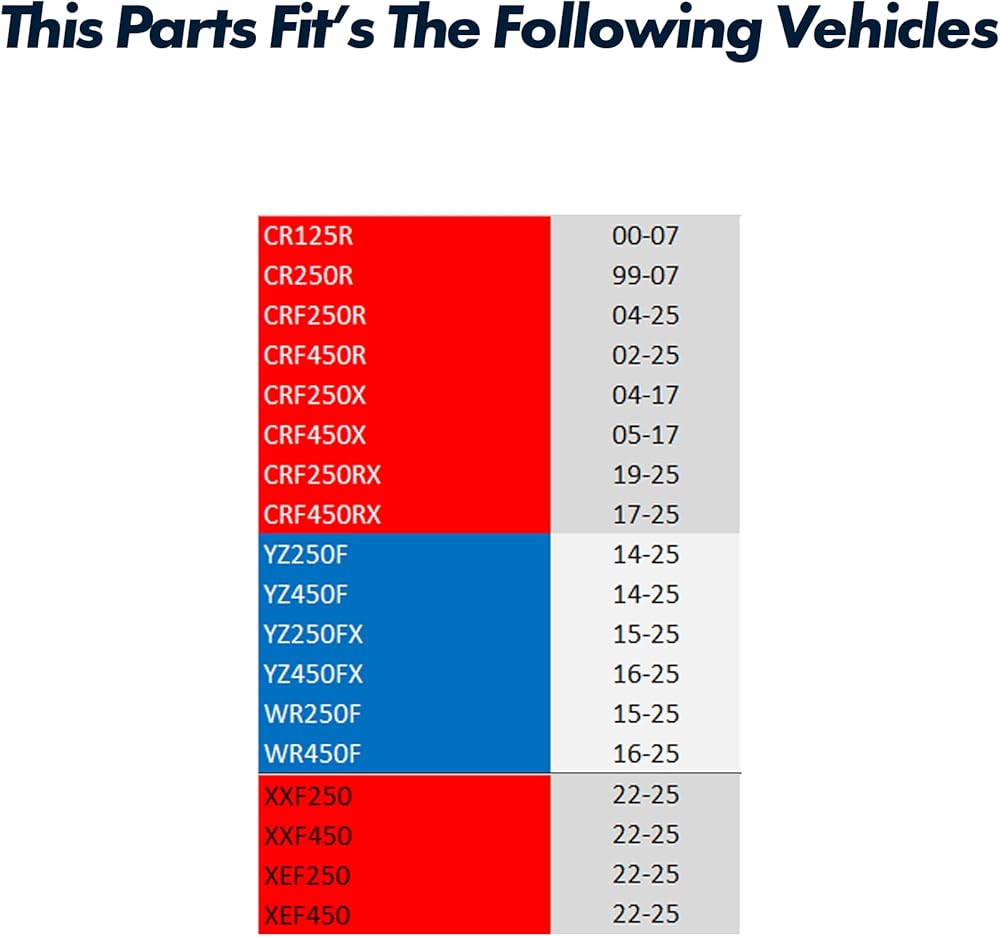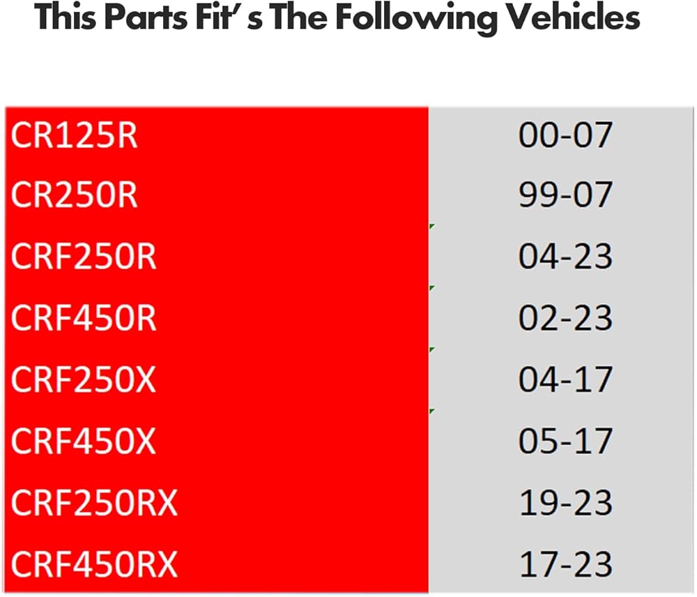 - Compatible with Honda CR125R (2000 - 2007) / CR250R (1999 - 2007) / CRF250R (2004 - 2024) / CRF450R (2002 - 2024) / CRF250X (2004 - 2017) / CRF450X (2005 - 2017) / CRF450FX (2017 - 2024).